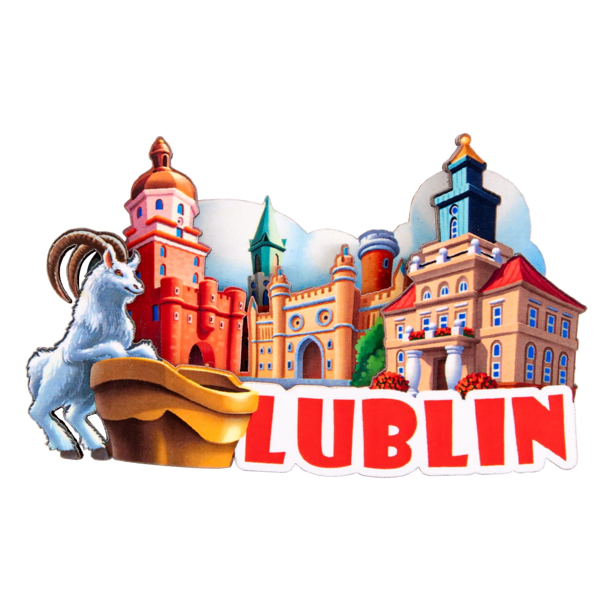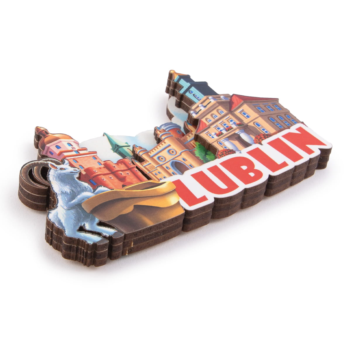 Polyresinowy, fakturowany, ręcznie malowany magnes przedstawiający ratusz i Bramę Krakowską oraz herb Lublina. W magnesie znajduje się również napis "Lublin". Na rewersie znajduje się duży i mocny magnes ferrytowy.