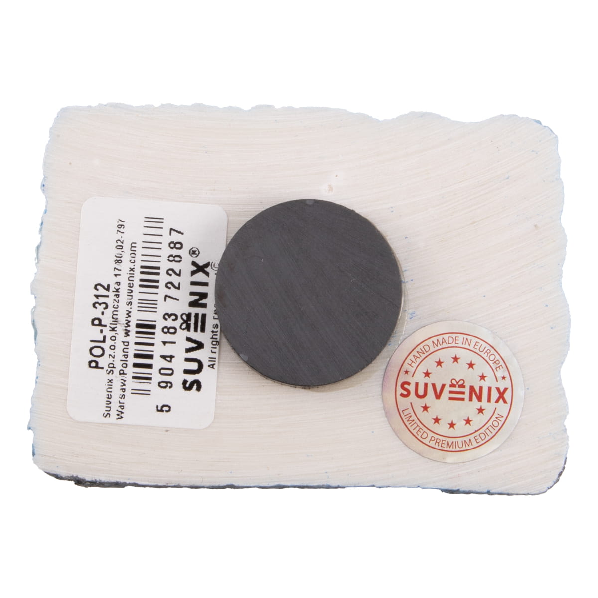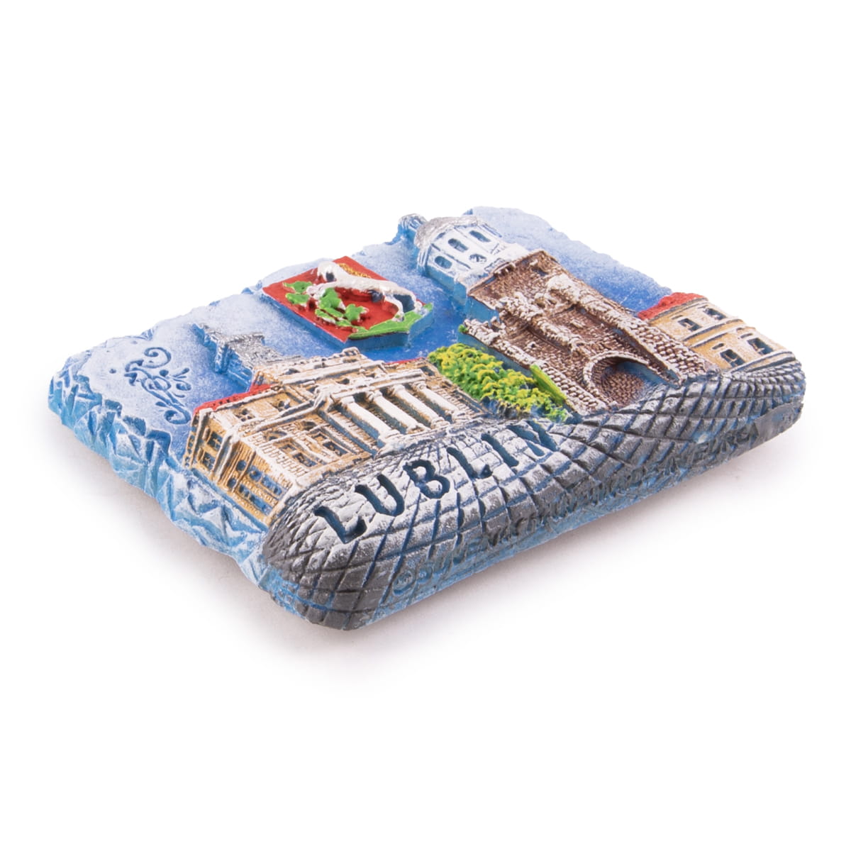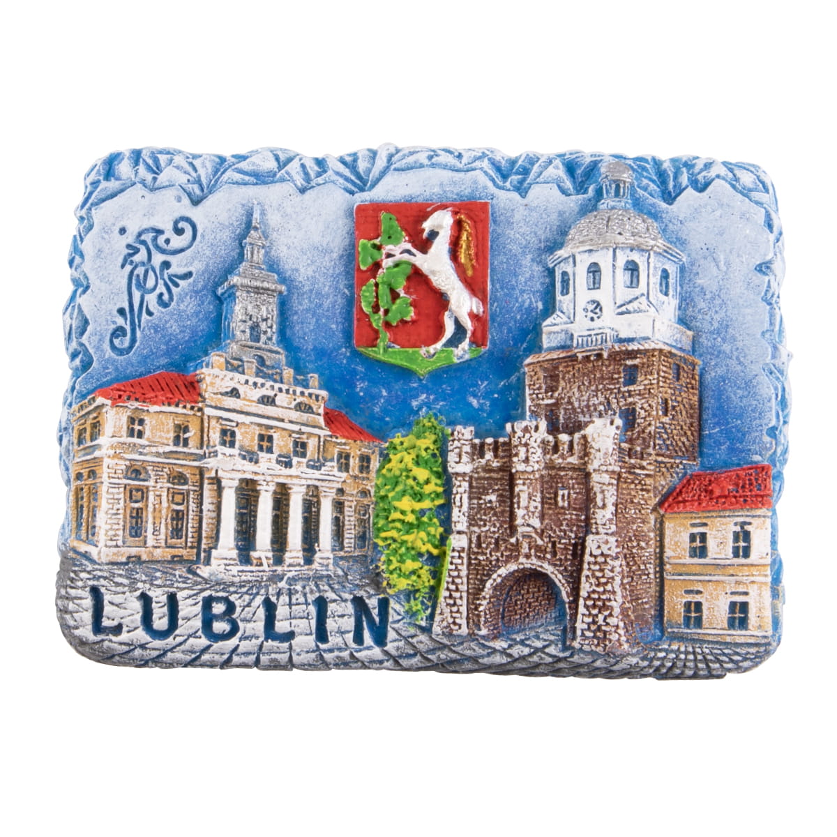 Polyresinowy, fakturowany, ręcznie malowany magnes przedstawiający ratusz i Bramę Krakowską oraz herb Lublina. W magnesie znajduje się również napis "Lublin". Na rewersie znajduje się duży i mocny magnes ferrytowy.