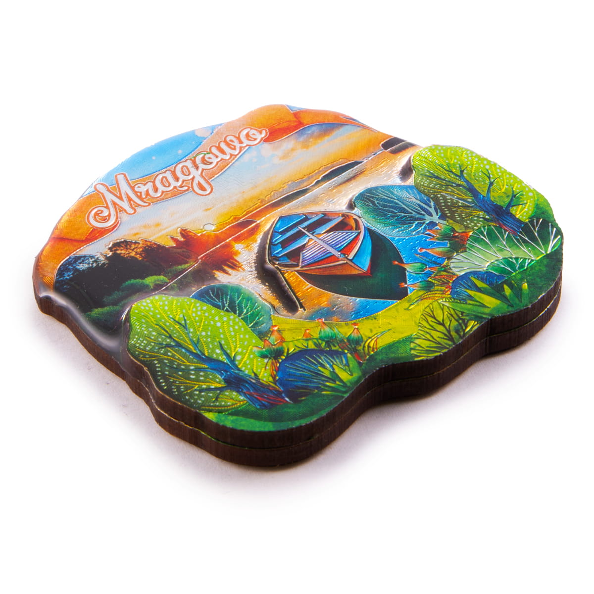Wykonany z MDF dwuwarstwowy magnes metalizowany, przedstawiający piękny zachód słońca nad jeziorem ozdobionym bujną zielenią. Wśród prezentowanych na magnesie elementów widzimy między innymi zacumowaną łódkę. Widoczny jest na nim też wyraźny napis "Mrągowo". Front magnesu zalany jest żywicą epoksydową zapewniającą trwałość kolorów i nadającą połysk. Na rewersie umieszczona jest duża, wysokiej klasy folia magnetyczna zapewniająca trwałe, bezpieczne umocowanie pamiątki na metalowej powierzchni.