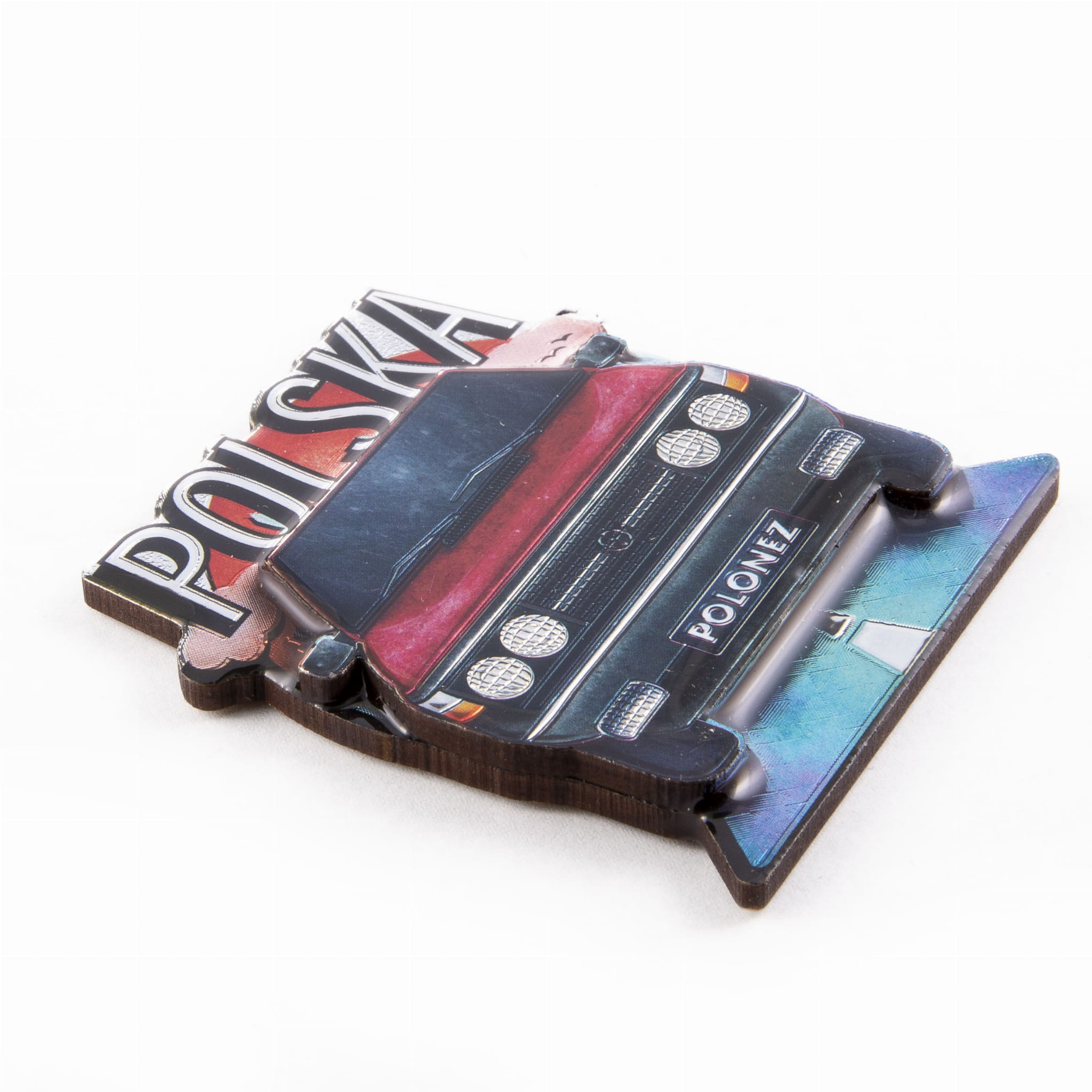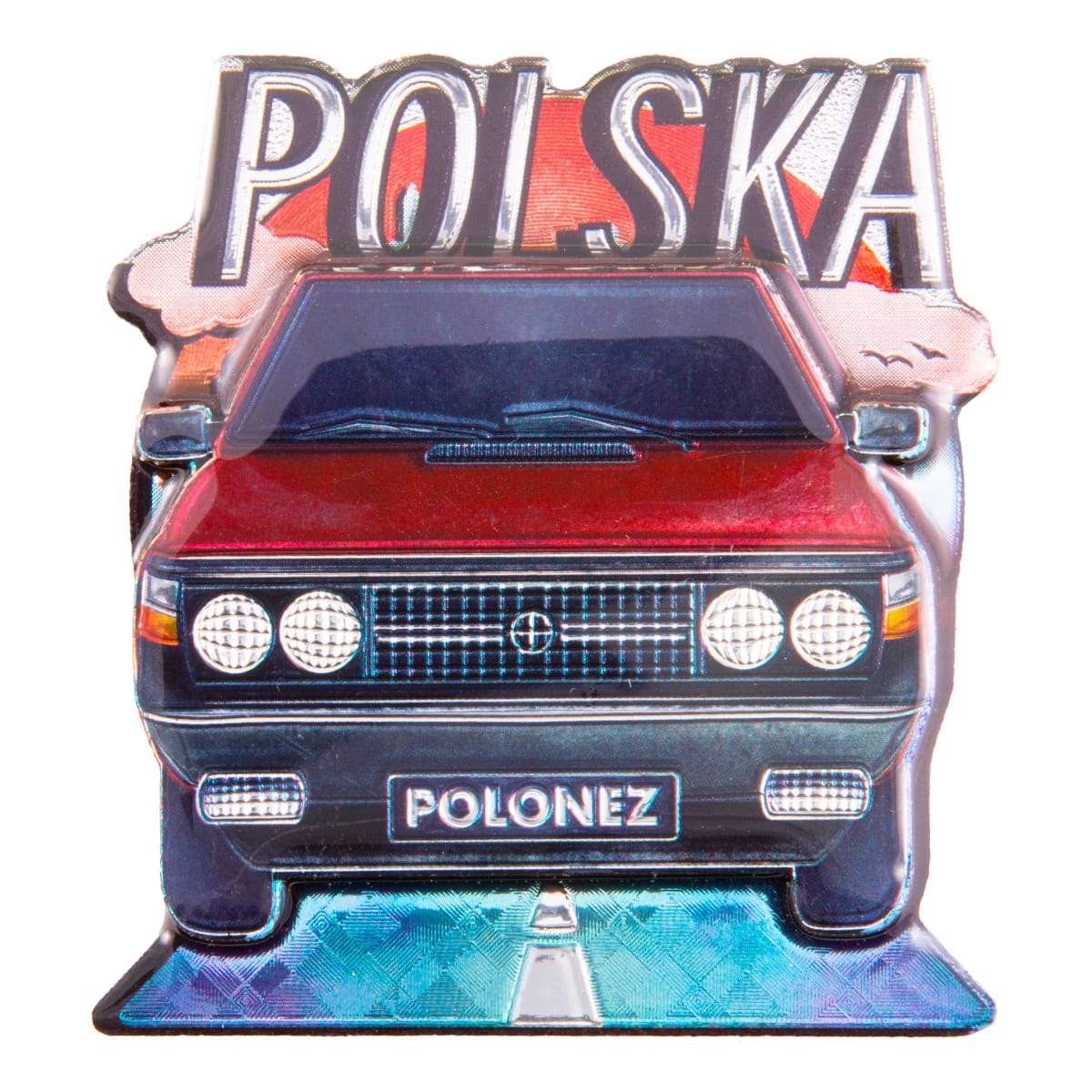 Wykonany z MDF, dwuwarstwowy, barwny magnes metalizowany, przedstawiający czerwony samochód marki Polonez - jest to element kolekcji "Klasyki Polskich Dróg". Nad samochodem widnieje duży, wyraźny napis "Polska". Cały front magnesu zalany jest żywicą epoksydową zapewniającą trwałość kolorów i nadającą połysk. Na rewersie pamiątki znajduje się duża taśma magnetyczna.