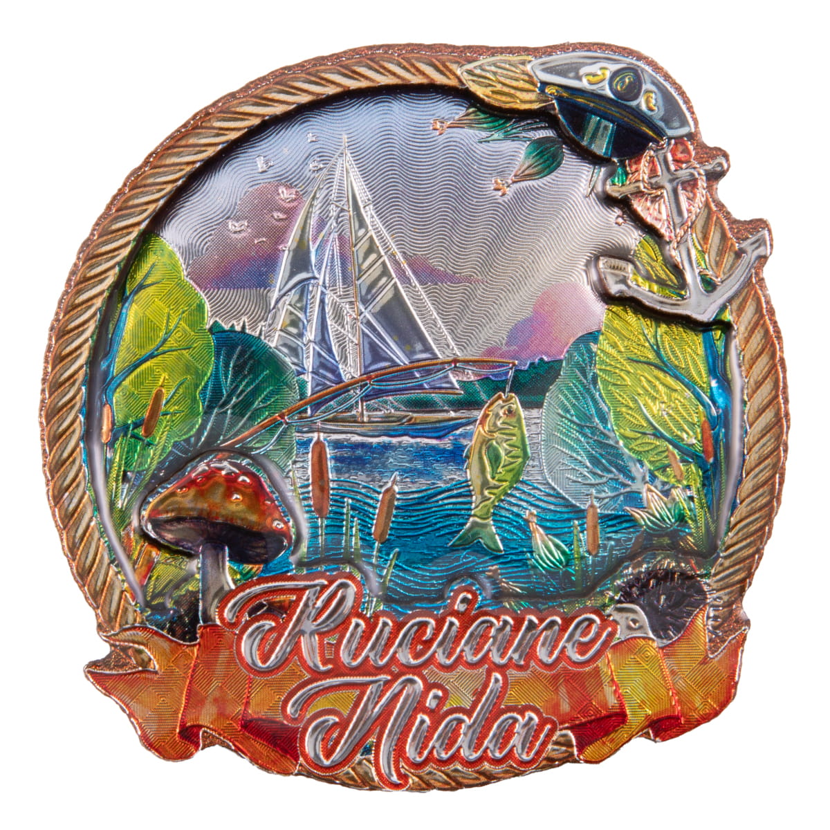 Wykonany z MDF dwuwarstwowy magnes metalizowany, przedstawiający żaglówki pływającej po jeziorze ozdobionym bujną zielenią. Wśród prezentowanych na magnesie elementów widzimy między innymi kotwicę, grzybek, jeża i wędkę. Widoczny jest na nim też wyraźny napis "Ruciane Nida". Front magnesu zalany jest żywicą epoksydową zapewniającą trwałość kolorów i nadającą połysk. Na rewersie umieszczona jest duża, wysokiej klasy folia magnetyczna zapewniająca trwałe, bezpieczne umocowanie pamiątki na metalowej powierzchni.