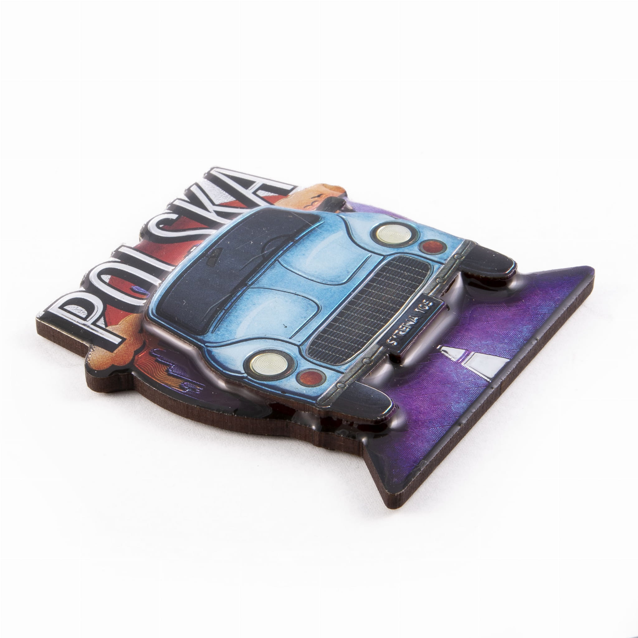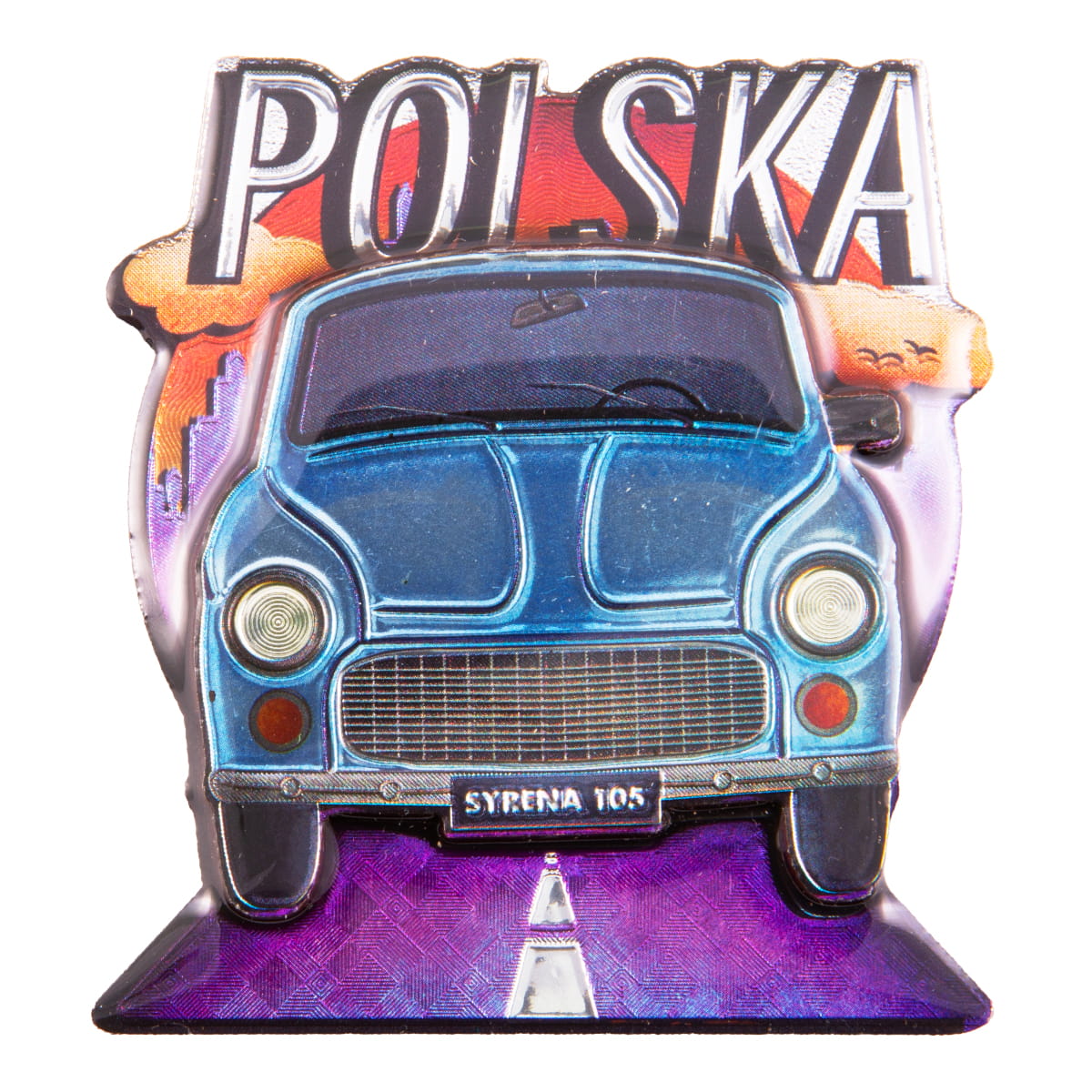 Wykonany z MDF, dwuwarstwowy, barwny magnes metalizowany, przedstawiający samochód marki Syrena 105 - jest to element kolekcji "Klasyki Polskich Dróg". Nad samochodem widnieje duży, wyraźny napis "Polska". Cały front magnesu zalany jest żywicą epoksydową zapewniającą trwałość kolorów i nadającą połysk. Na rewersie pamiątki znajduje się duża taśma magnetyczna.