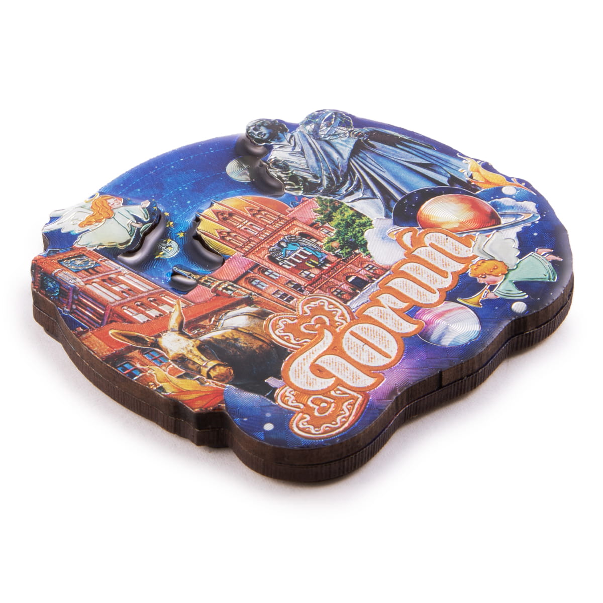 Wykonany z MDF dwuwarstwowy magnes metalizowany, przedstawiający panoramę Torunia. Wśród prezentowanych na magnesie elementów zauważyć można między innymi pomnik Kopernika, Ratusz Staromiejski oraz osiołka. Widoczny jest na nim też wyraźny napis "Toruń". Front magnesu zalany jest żywicą epoksydową zapewniającą trwałość kolorów i nadającą połysk. Na rewersie umieszczona jest duża, wysokiej klasy folia magnetyczna zapewniająca trwałe, bezpieczne umocowanie pamiątki na metalowej powierzchni.