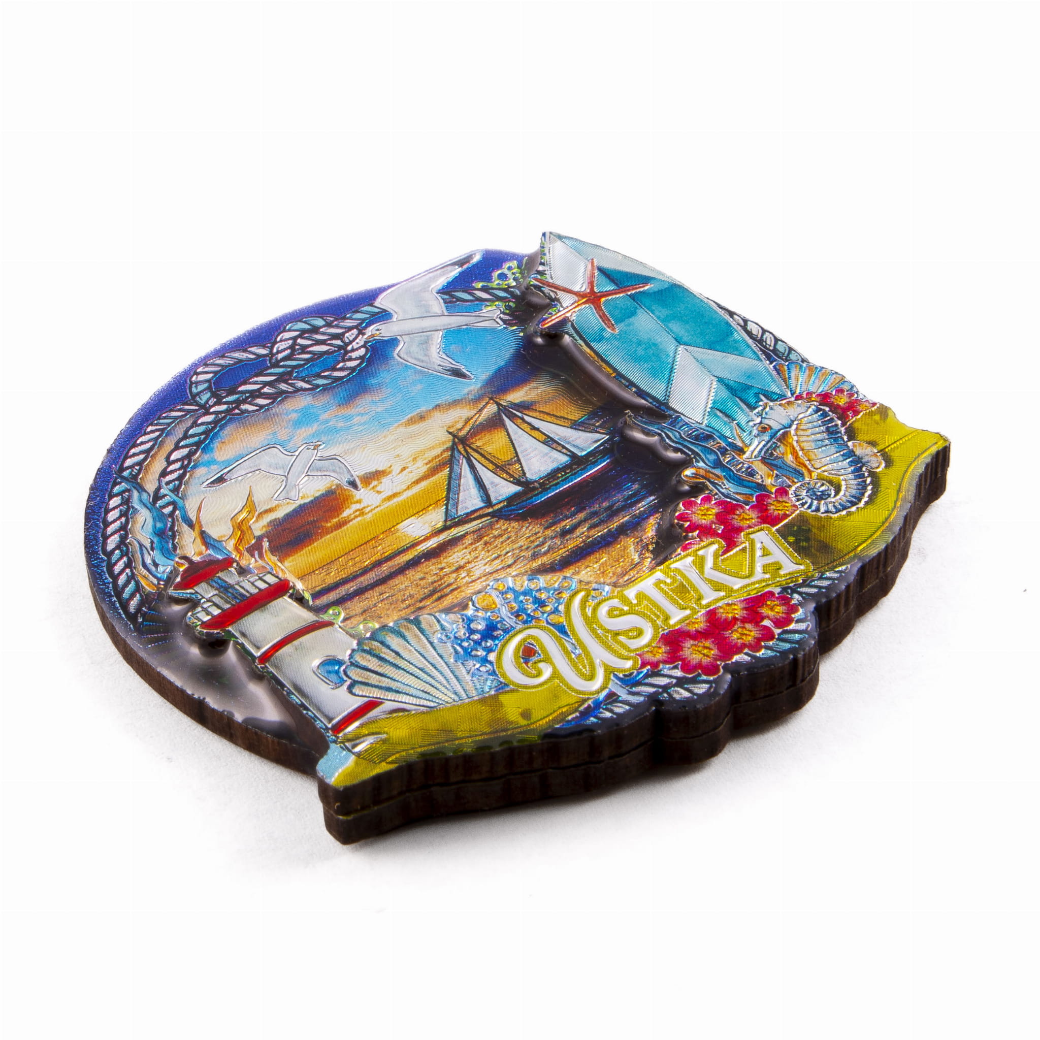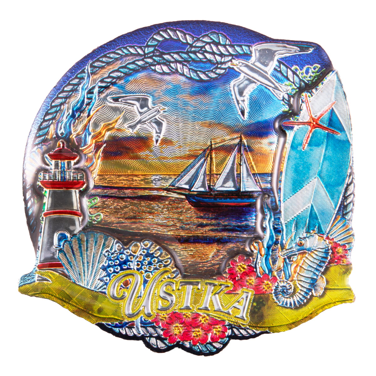 Wykonany z MDF dwuwarstwowy magnes metalizowany, przedstawiający nadmorską panoramę. Wśród prezentowanych na magnesie elementów zauważyć można między innymi żaglowiec, deska surfingowa i latarnia morska. Widoczny jest na nim też wyraźny napis "Ustka". Front magnesu zalany jest żywicą epoksydową zapewniającą trwałość kolorów i nadającą połysk. Na rewersie umieszczona jest duża, wysokiej klasy taśma magnetyczna zapewniająca trwałe, bezpieczne umocowanie pamiątki na metalowej powierzchni.