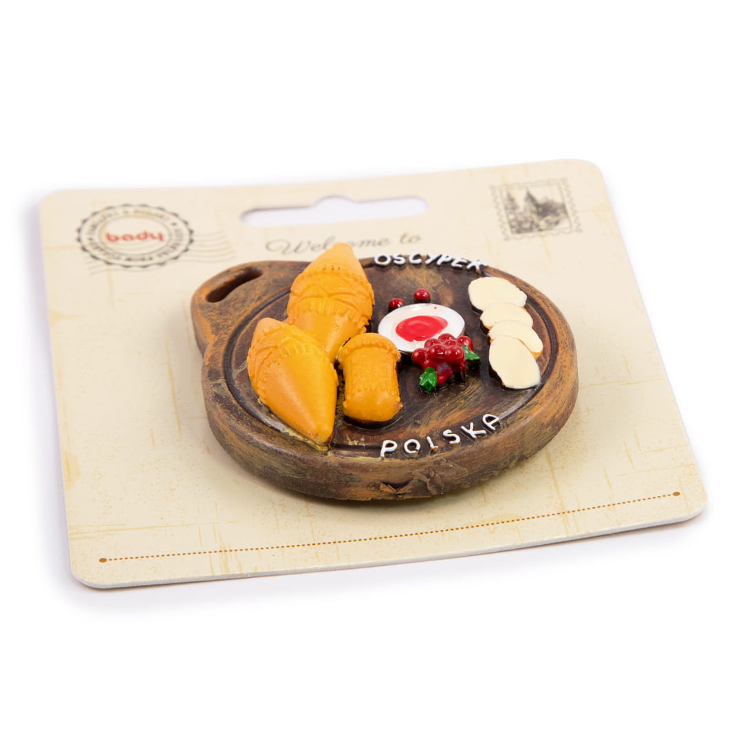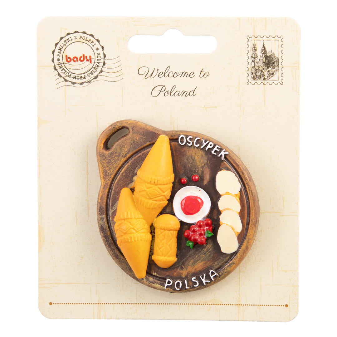 Wykonany z polyresinu magnes w kształcie drewnianej, okrągłej deski, na której leżą tradycyjne polskie oscypki oraz dodatki do nich. Na desce widnieją napisy "Polska" oraz "Oscypek". Ręcznie malowana pamiątka o wyjątkowym charakterze. Na rewersie suweniru znajduje się duży, mocny magnes ferrytowy zapewniający bezpieczne przyczepienie pamiątki do metalowych powierzchni.