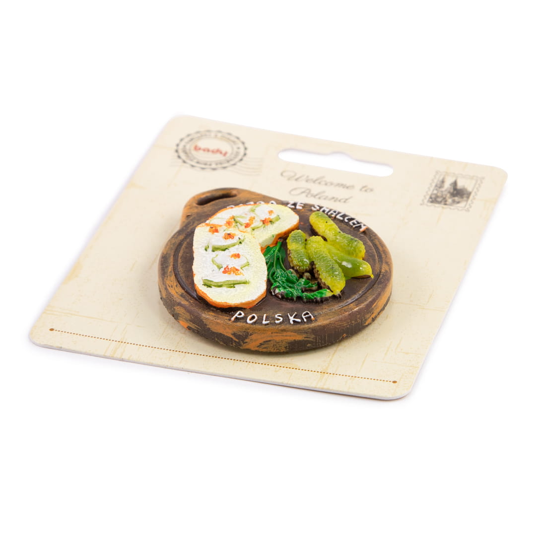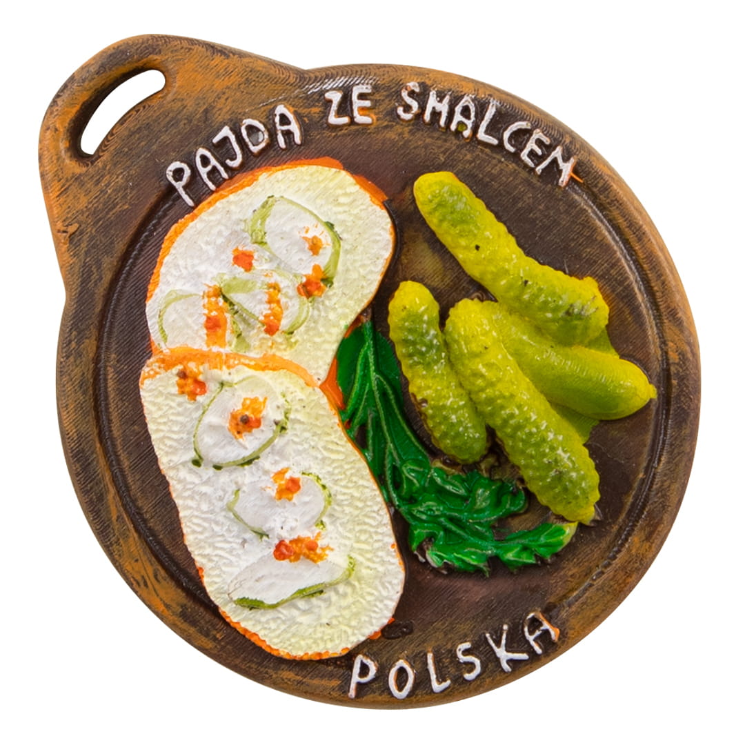 Wykonany z polyresinu magnes w kształcie drewnianej, okrągłej deski, na której leżą dwie kromki chleba ze smalcem i ogórkami kiszonymi. Na desce widnieją napisy "Polska" oraz "Pajda ze smalcem". Ręcznie malowana pamiątka o wyjątkowym charakterze. Na rewersie suweniru znajduje się duży, mocny magnes ferrytowy zapewniający bezpieczne przyczepienie pamiątki do metalowych powierzchni.