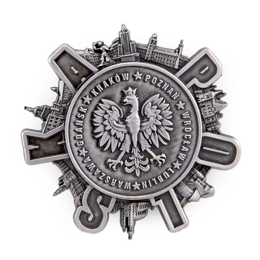 Metalowy, trzywarstwowy, żłobiony magnes w nieprzeciętnej formie. Górna warstwa prezentuje orła w koronie z wypisanymi kilkoma z głównych miast: "Kraków, Poznań, Wrocław, Lublin, Warszawa, Gdańsk". Część środkowa jest obrotowa i przedstawia napis "Polska" wraz z charakterystycznymi dla wymienionych na pierwszej warstwie miast zabytkami. Trzecią warstwą jest metalowe koło z magnesem umożliwiającym trwałe przymocowanie do metalowej powierzchni.