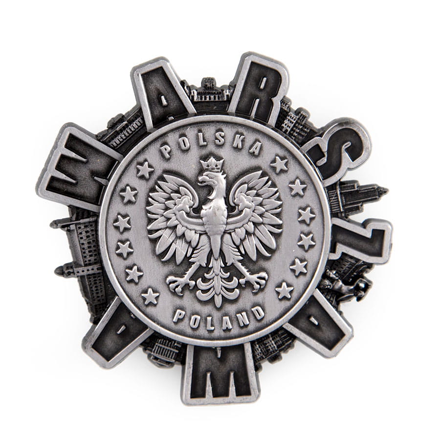 Metalowy, trzywarstwowy, żłobiony magnes w nieprzeciętnej formie. Górna warstwa prezentuje orła w koronie z napisami "Polska" i "Poland". Część środkowa jest obrotowa i przedstawia nazwę miasta "Warszawa" wraz z charakterystycznymi dla niego elementami. Trzecią warstwą jest metalowe koło z magnesem umożliwiającym trwałe przymocowanie do metalowej powierzchni.