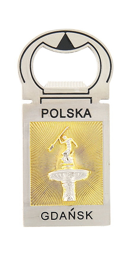 Metalowy, bardzo starannie wykonany magnes, pełniący również rolę otwieracza do butelek. Jest on ozdobiony wizerunkiem Pomnika Neptuna na złotym tle. Dodatkowo na otwieraczu zamieszczono napisy "Polska" i "Gdańsk".