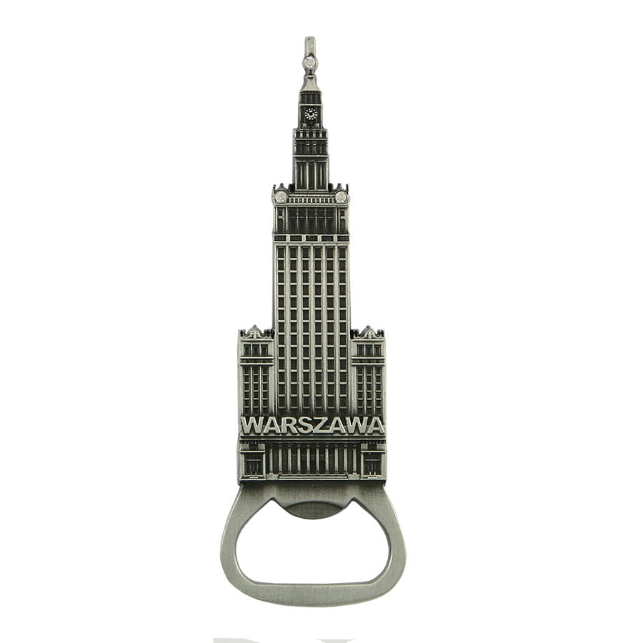 Input: Metalowy magnes z otwieraczem w kształcie Pałacu Kultury i Nauki. Prócz unikatowej formy magnes wyróżnia również szczegółowe wykonanie, a także zamieszczone w nim białe cyrkonie. Na otwieraczu widnieje wyraźny napis "Warszawa". Mocowanie stanowi mały, mocny magnes gwarantujący trwałe mocowanie do metalowych powierzchni.