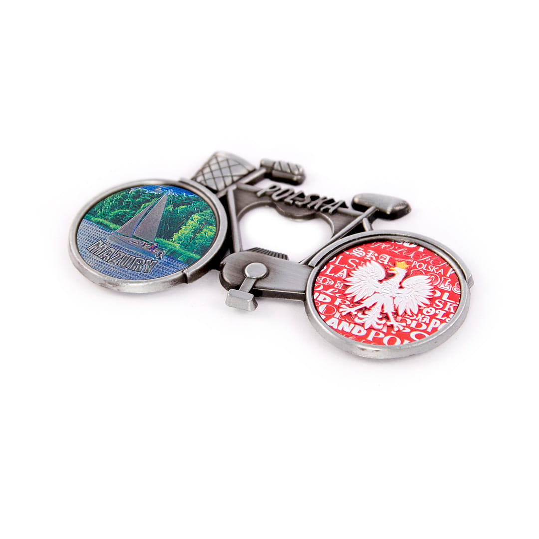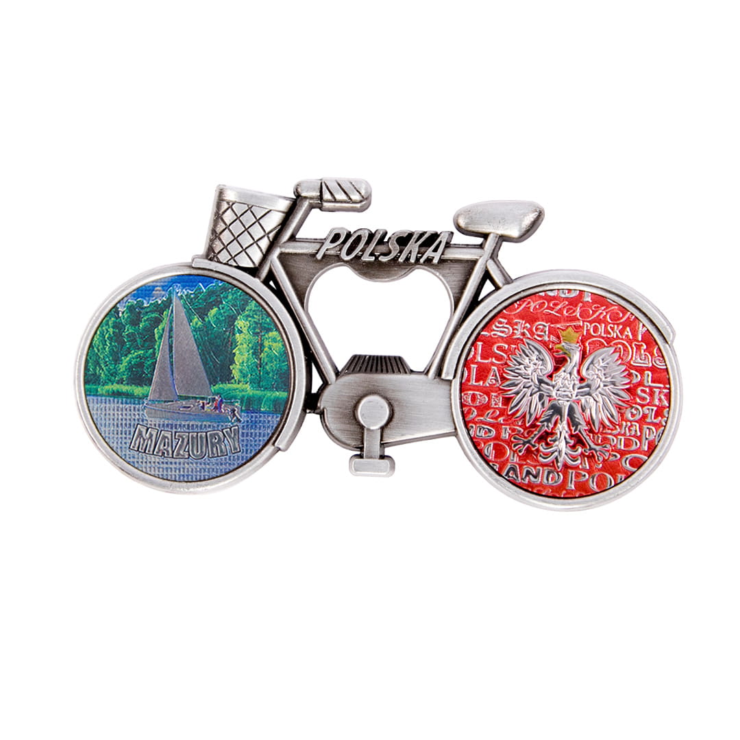 Metalowy, elegancki magnes pełniący również funkcję otwieracza, w kształcie rowerka z koszykiem, którego rama ozdobiona jest napisem Polska. Koła roweru wypełnione są kolorowymi, fakturowanymi naklejkami o tłoczonej, przyjemnej w dotyku powierzchni, mieniącej się metalicznie w świetle. Tylne koło przedstawia orła w koronie na biało-czerwonym tle utworzonym z napisów Polska. Przednie koło prezentuje widok na żaglówkę oraz wyraźny, wypukły, błyszczący, wyglądają jak niklowany napis Mazury. Na rewersie pamiątki znajdują się dwa małe, ale mocne magnesy neodymowe zapewniające trwałe, bezpieczne przyczepienie przedmiotu do metalowej powierzchni.