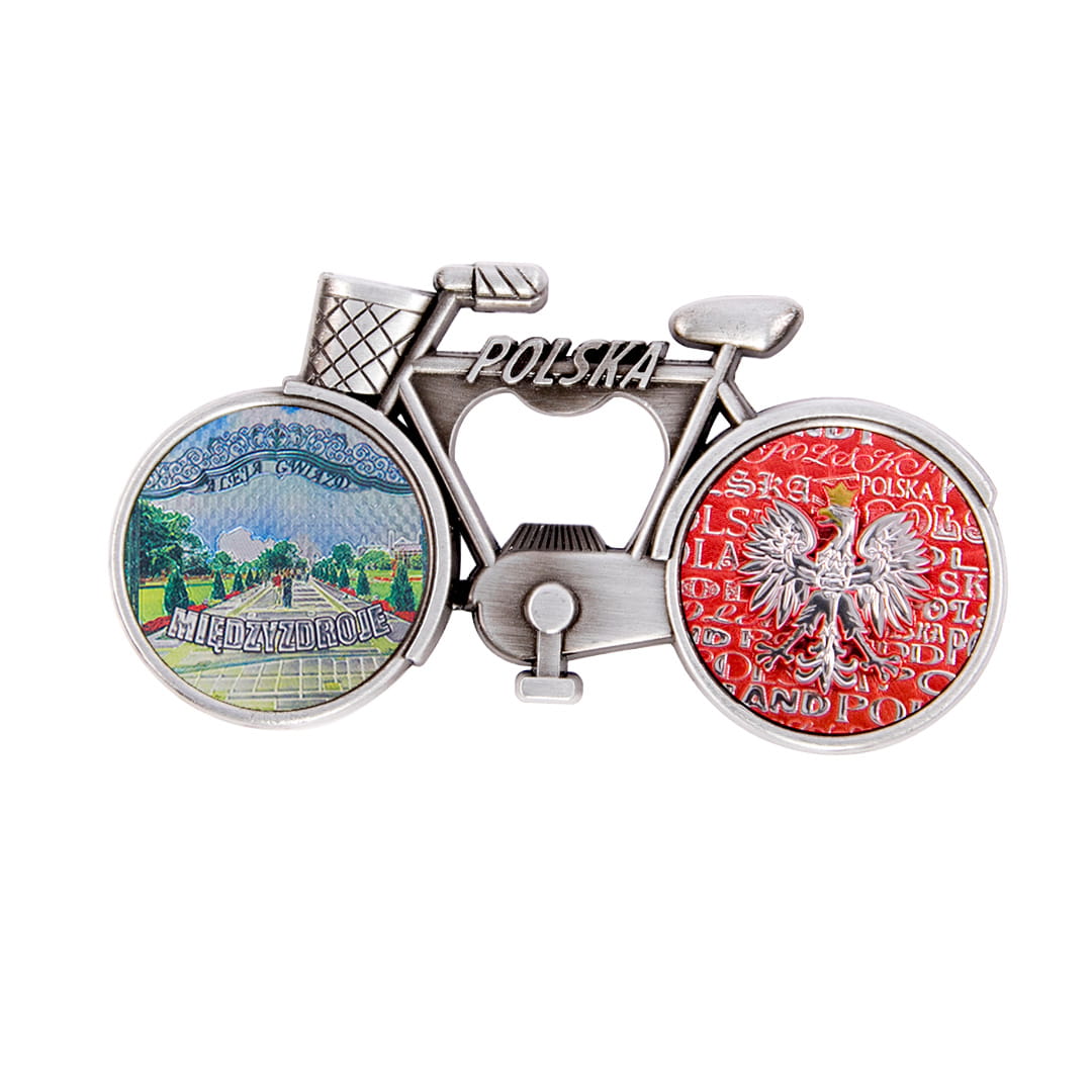 Metalowy, elegancki magnes pełniący również funkcję otwieracza, w kształcie rowerka z koszykiem, którego rama ozdobiona jest napisem Polska. Koła roweru wypełnione są kolorowymi, fakturowanymi naklejkami o tłoczonej, przyjemnej w dotyku powierzchni, mieniącej się metalicznie w świetle. Tylne koło przedstawia orła w koronie na biało-czerwonym tle utworzonym z napisów Polska.