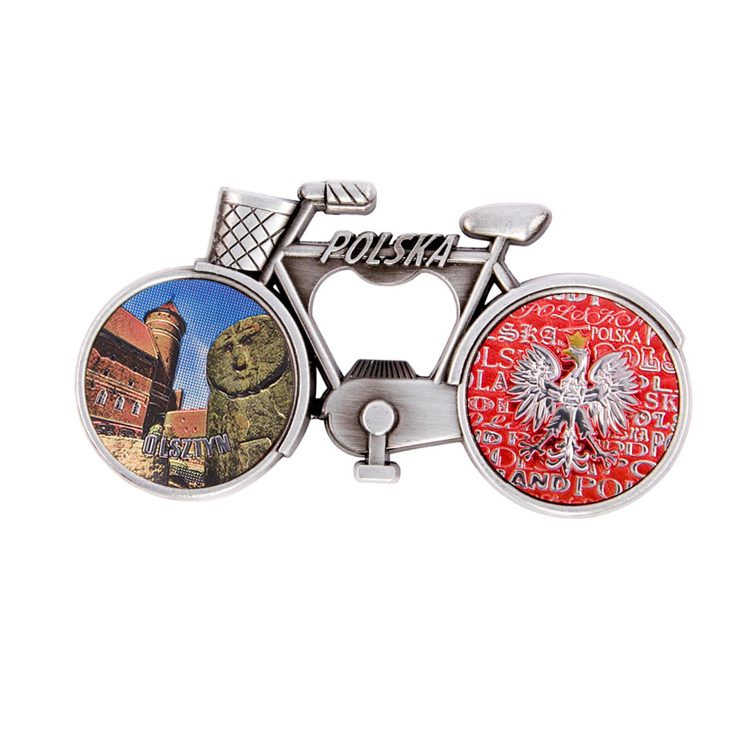 Metalowy, elegancki magnes pełniący również funkcję otwieracza, w kształcie rowerka z koszykiem, którego rama ozdobiona jest napisem Polska. Koła roweru wypełnione są kolorowymi, fakturowanymi naklejkami o tłoczonej, przyjemnej w dotyku powierzchni, mieniącej się metalicznie w świetle. Tylne koło przedstawia orła w koronie na biało-czerwonym tle utworzonym z napisów Polska.