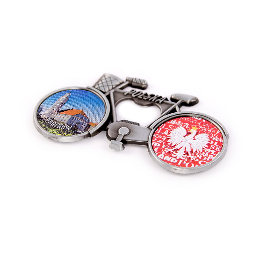Metalowy, elegancki magnes pełniący również funkcję otwieracza, w kształcie rowerka z koszykiem, którego rama ozdobiona jest napisem Polska. Koła roweru wypełnione są kolorowymi, fakturowanymi naklejkami o tłoczonej, przyjemnej w dotyku powierzchni, mieniącej się metalicznie w świetle. Tylne koło przedstawia orła w koronie na biało-czerwonym tle utworzonym z napisów Polska. Przednie koło prezentuje widok na ratusz oraz wyraźny, wypukły, błyszczący, wyglądają jak niklowany napis Paczków. Na rewersie pamiątki znajdują się dwa małe, ale mocne magnesy neodymowe zapewniające trwałe, bezpieczne przyczepienie przedmiotu do metalowej powierzchni.
