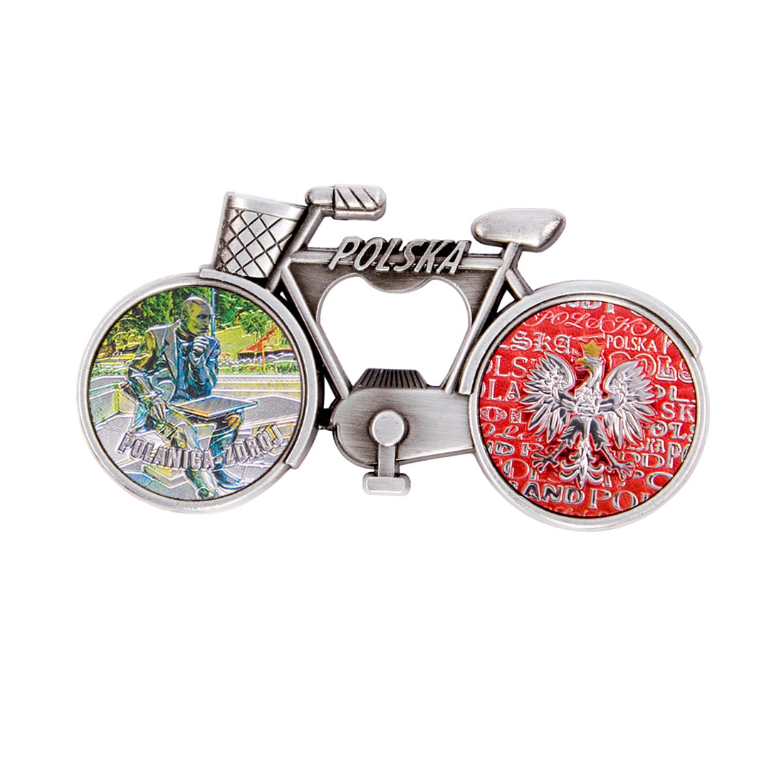 Metalowy, elegancki magnes pełniący również funkcję otwieracza, w kształcie rowerka z koszykiem, którego rama ozdobiona jest napisem Polska. Koła roweru wypełnione są kolorowymi, fakturowanymi naklejkami o tłoczonej, przyjemnej w dotyku powierzchni, mieniącej się metalicznie w świetle. Tylne koło przedstawia orła w koronie na biało-czerwonym tle utworzonym z napisów Polska. Przednie koło prezentuje widok na Ławeczkę Akiby Rubinsteina oraz wyraźny, wypukły, błyszczący, wyglądają jak niklowany napis Polanica-Zdrój. Na rewersie pamiątki znajdują się dwa małe, ale mocne magnesy neodymowe zapewniające trwałe, bezpieczne przyczepienie przedmiotu do metalowej powierzchni.