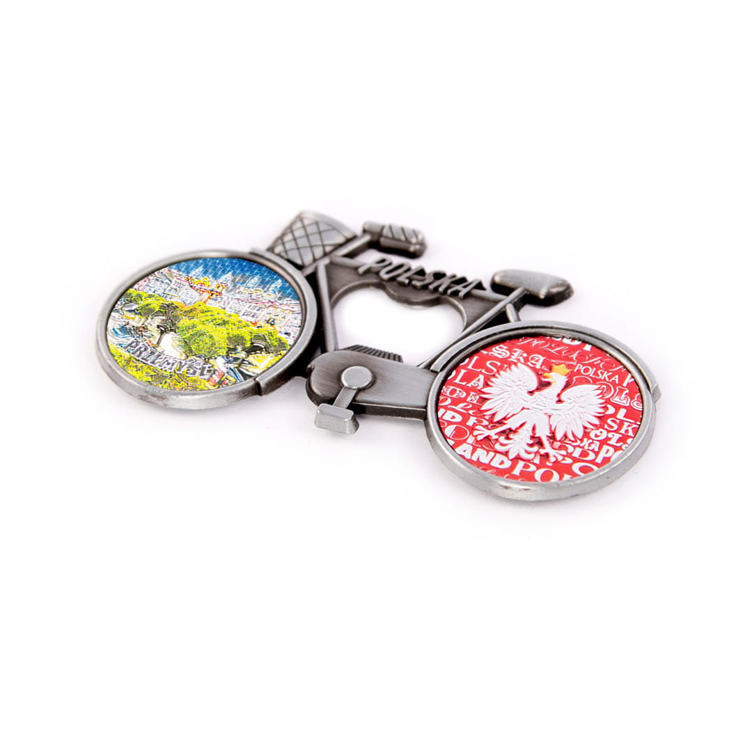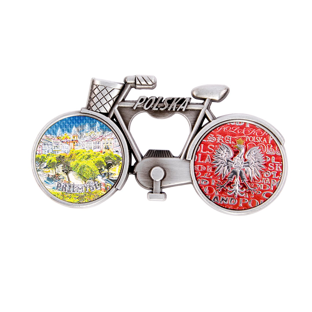 Metalowy, elegancki magnes pełniący również funkcję otwieracza, w kształcie rowerka z koszykiem, którego rama ozdobiona jest napisem Polska. Koła roweru wypełnione są kolorowymi, fakturowanymi naklejkami o tłoczonej, przyjemnej w dotyku powierzchni, mieniącej się metalicznie w świetle. Tylne koło przedstawia orła w koronie na biało-czerwonym tle utworzonym z napisów Polska. Przednie koło prezentuje widok na rynek oraz wyraźny, wypukły, błyszczący, wyglądają jak niklowany napis Przemyśl. Na rewersie pamiątki znajdują się dwa małe, ale mocne magnesy neodymowe zapewniające trwałe, bezpieczne przyczepienie przedmiotu do metalowej powierzchni.