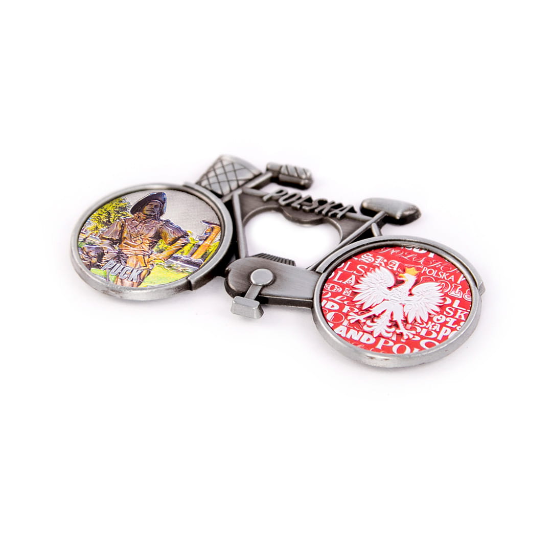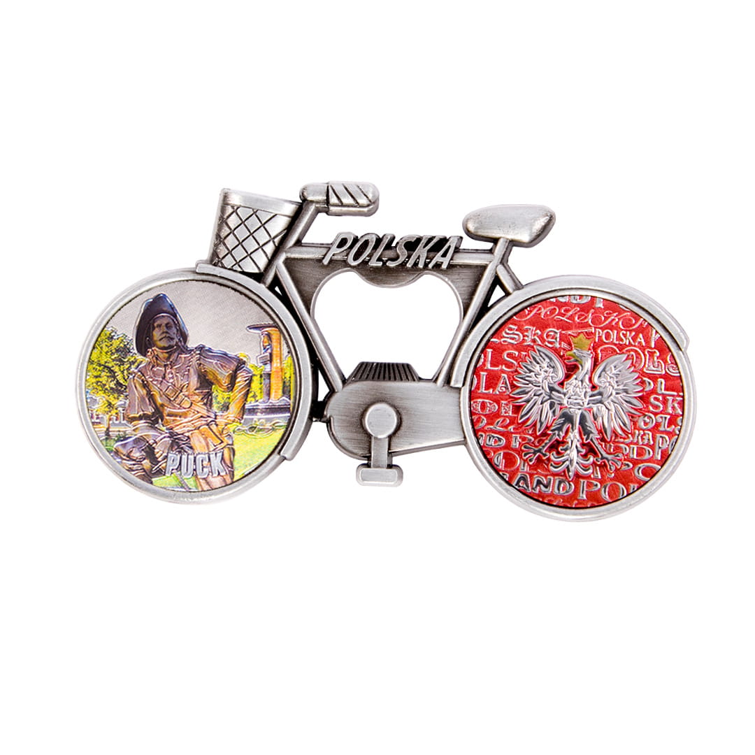 Metalowy, elegancki magnes pełniący również funkcję otwieracza, w kształcie rowerka z koszykiem, którego rama ozdobiona jest napisem Polska. Koła roweru wypełnione są kolorowymi, fakturowanymi naklejkami o tłoczonej, przyjemnej w dotyku powierzchni, mieniącej się metalicznie w świetle. Tylne koło przedstawia orła w koronie na biało-czerwonym tle utworzonym z napisów Polska. Przednie koło prezentuje widok na pomnik Kapra oraz wyraźny, wypukły, błyszczący, wyglądają jak niklowany napis Puck. Na rewersie pamiątki znajdują się dwa małe, ale mocne magnesy neodymowe zapewniające trwałe, bezpieczne przyczepienie przedmiotu do metalowej powierzchni.