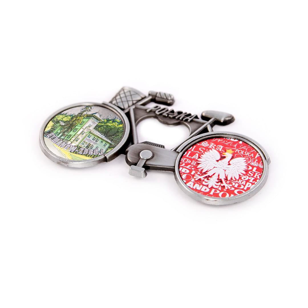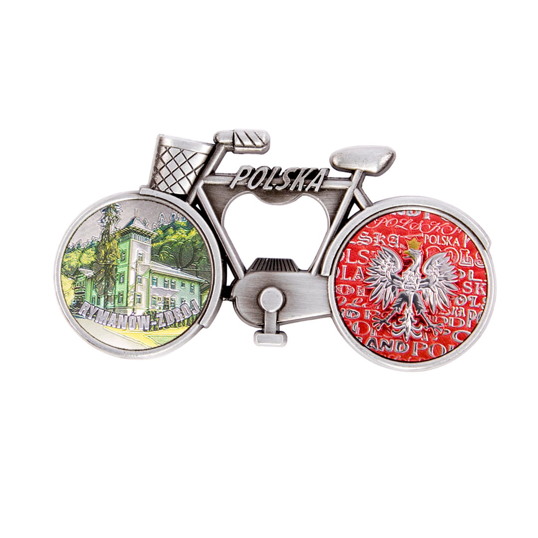 Metalowy, elegancki magnes pełniący również funkcję otwieracza, w kształcie rowerka z koszykiem, którego rama ozdobiona jest napisem Polska. Koła roweru wypełnione są kolorowymi, fakturowanymi naklejkami o tłoczonej, przyjemnej w dotyku powierzchni, mieniącej się metalicznie w świetle. Tylne koło przedstawia orła w koronie na biało-czerwonym tle utworzonym z napisów Polska. Przednie koło prezentuje widok na uzdrowisko oraz wyraźny, wypukły, błyszczący, wyglądają jak niklowany napis Rymanów-Zdrój. Na rewersie pamiątki znajdują się dwa małe, ale mocne magnesy neodymowe zapewniające trwałe, bezpieczne przyczepienie przedmiotu do metalowej powierzchni.