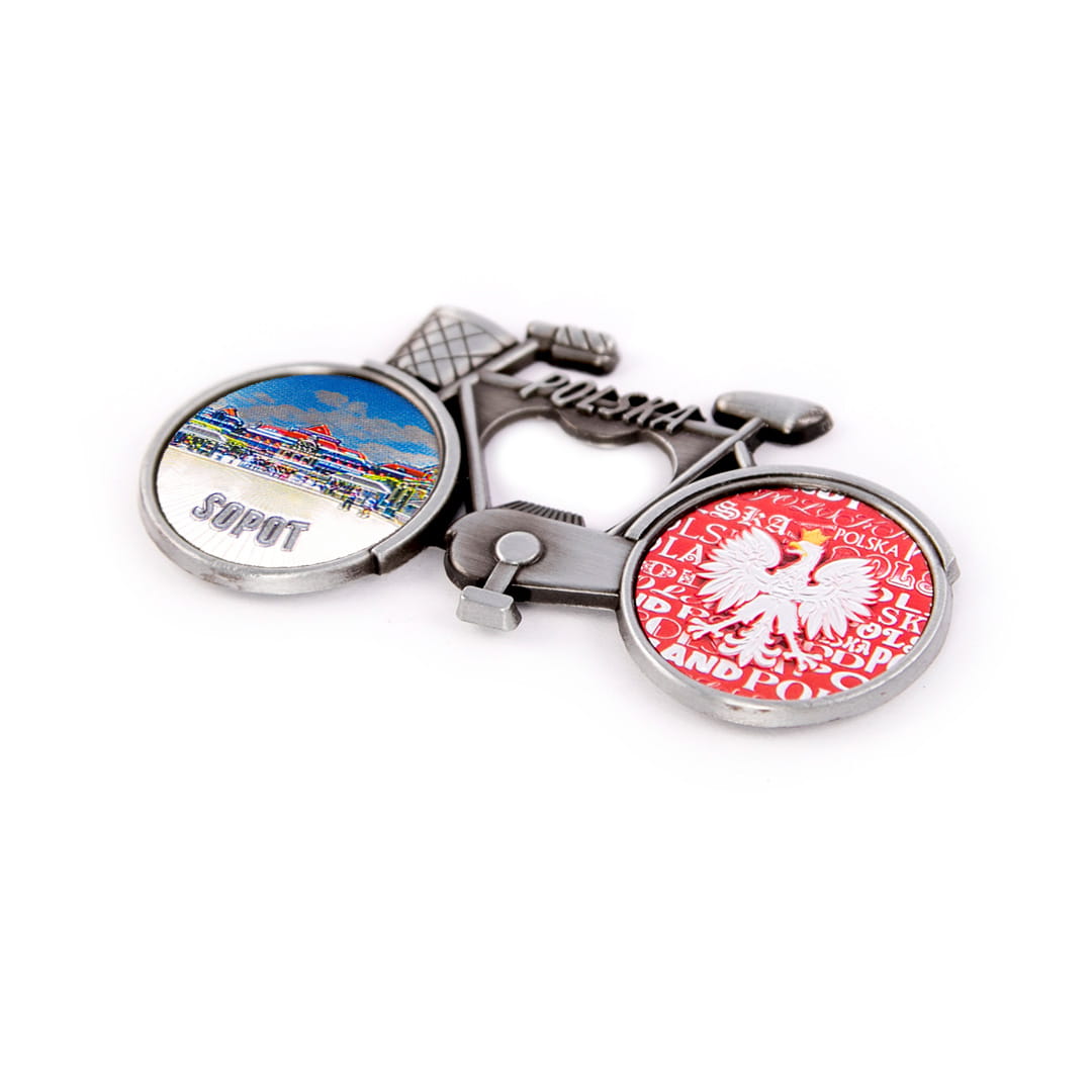 Metalowy, elegancki magnes pełniący również funkcję otwieracza, w kształcie rowerka z koszykiem, którego rama ozdobiona jest napisem Polska. Koła roweru wypełnione są kolorowymi, fakturowanymi naklejkami o tłoczonej, przyjemnej w dotyku powierzchni, mieniącej się metalicznie w świetle. Tylne koło przedstawia orła w koronie na biało-czerwonym tle utworzonym z napisów Polska.