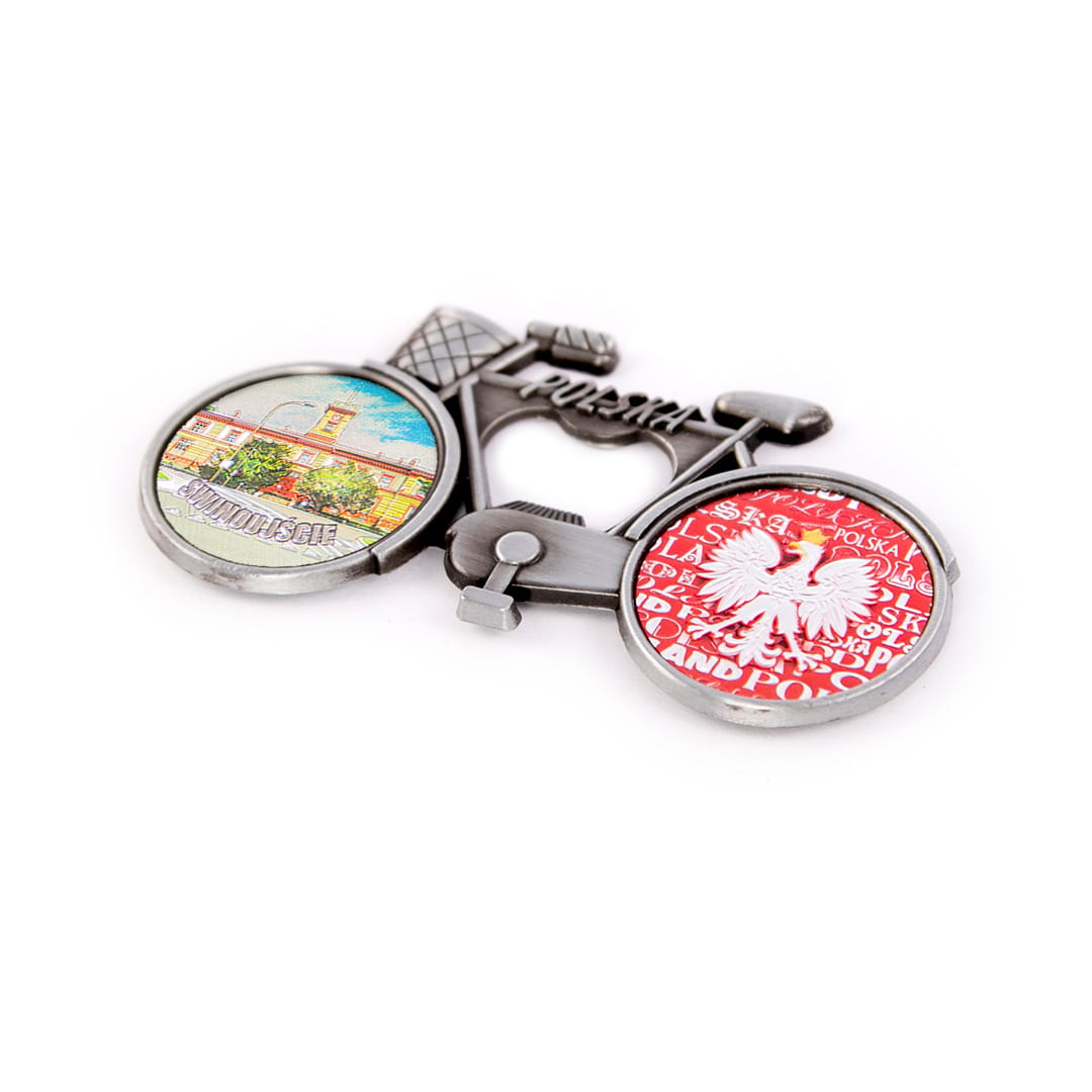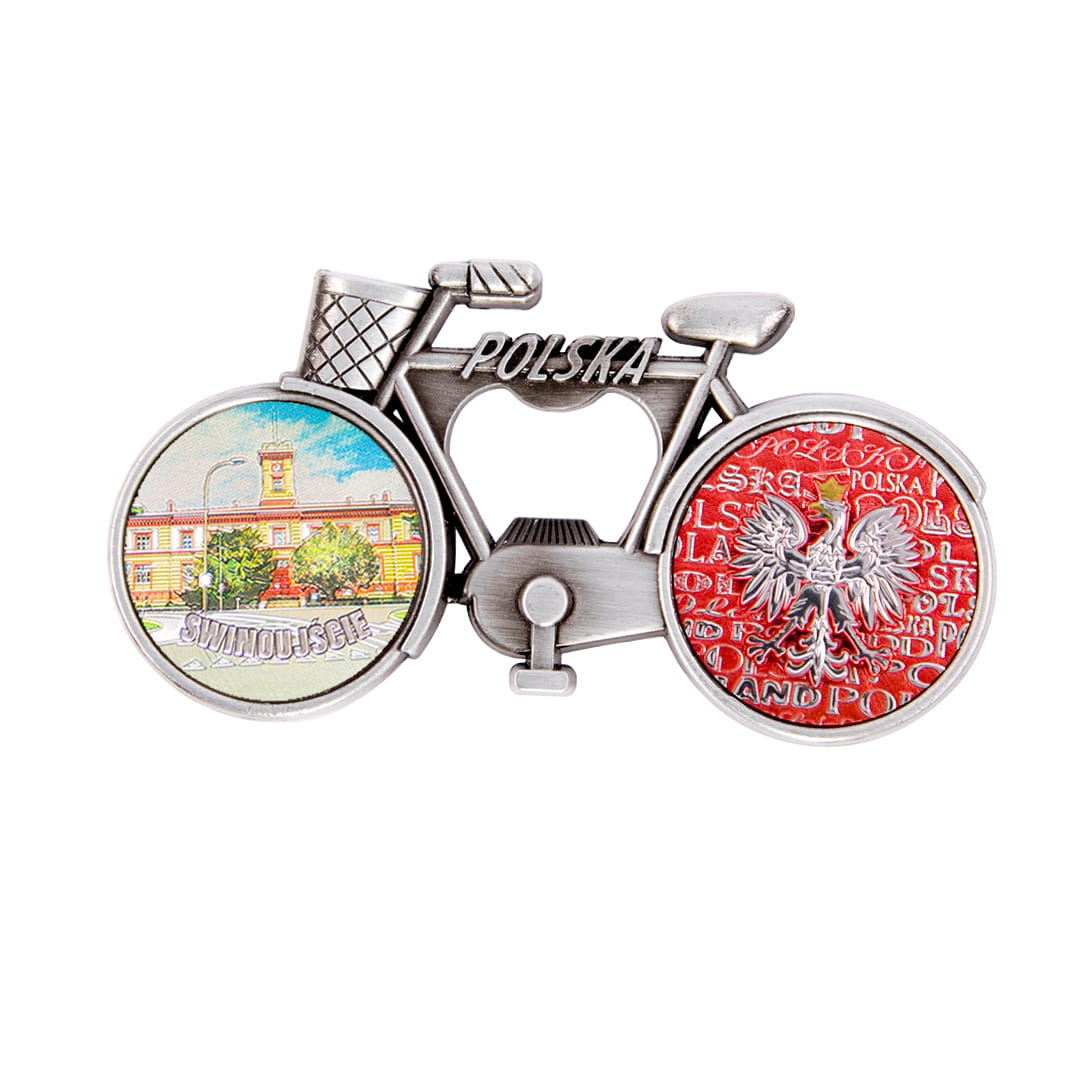 Metalowy, elegancki magnes pełniący również funkcję otwieracza, w kształcie rowerka z koszykiem, którego rama ozdobiona jest napisem Polska. Koła roweru wypełnione są kolorowymi, fakturowanymi naklejkami o tłoczonej, przyjemnej w dotyku powierzchni, mieniącej się metalicznie w świetle. Tylne koło przedstawia orła w koronie na biało-czerwonym tle utworzonym z napisów Polska.