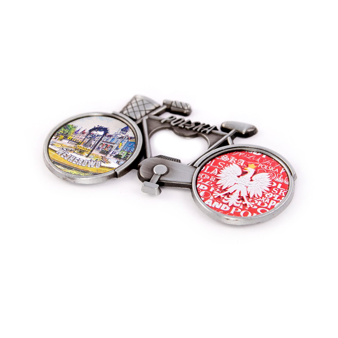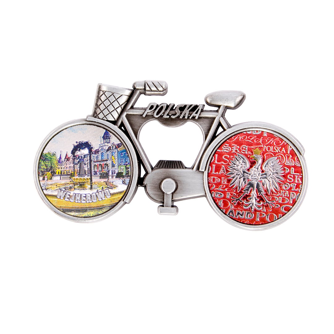 Metalowy, elegancki magnes pełniący również funkcję otwieracza, w kształcie rowerka z koszykiem, którego rama ozdobiona jest napisem Polska. Koła roweru wypełnione są kolorowymi, fakturowanymi naklejkami o tłoczonej, przyjemnej w dotyku powierzchni, mieniącej się metalicznie w świetle. Tylne koło przedstawia orła w koronie na biało-czerwonym tle utworzonym z napisów Polska.