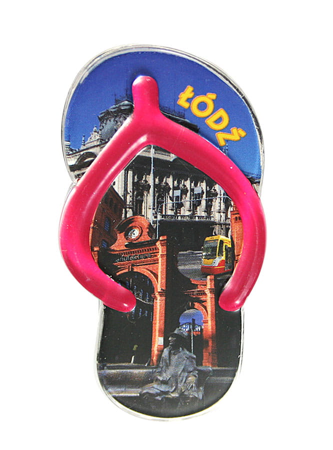 Plastikowy magnes - klips w kształcie klapka, z napisem Łódź i zabytkami tego miasta. Idealny do przypinania kartek na lodówkę.