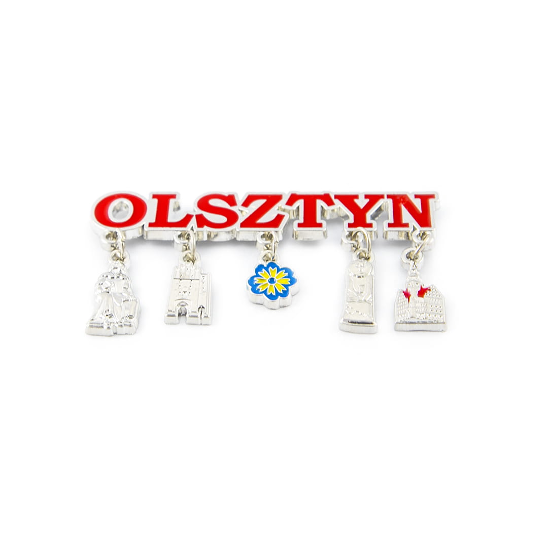 Metalowy magnes na lodówkę w kształcie napisu "Olsztyn" z zawieszkami charakterystycznymi dla tego miasta: Pomnik Kopernika, Baba Pruska, Brama Górna, ratusz oraz niebiesko-żółty kwiatek. Napis z nazwą miasta wypełniony jest czerwoną emalią. Na jego rewersie znajdują się dwa małe, lecz silne magnesy zapewniające trwałe, bezpieczne przyczepienie do metalowej powierzchni.