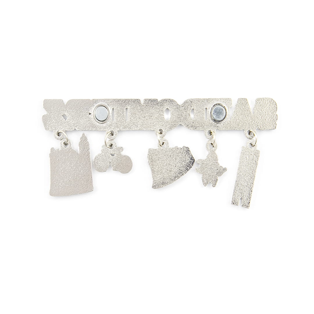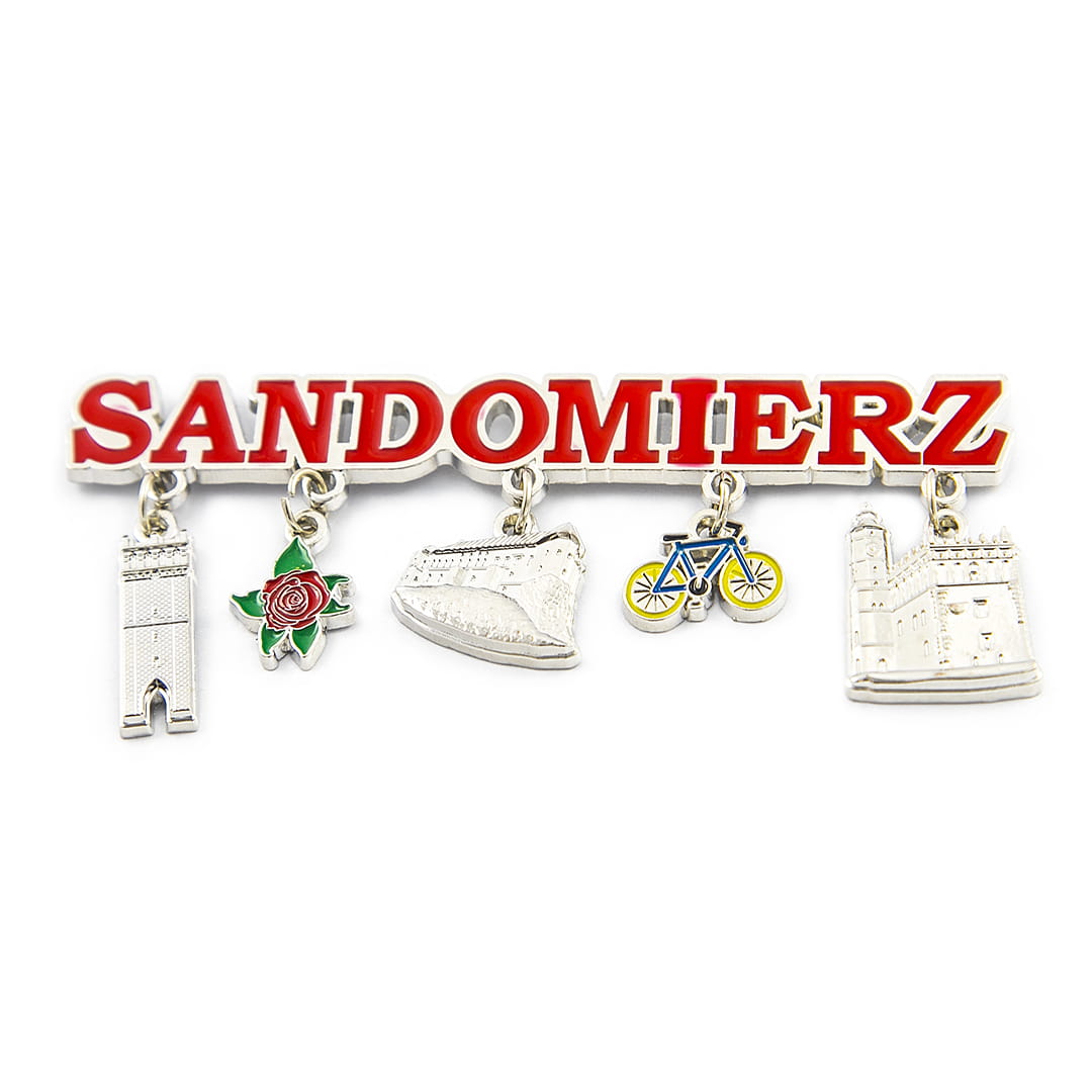 Metalowy magnes na lodówkę w kształcie napisu "Sandomierz" z zawieszkami charakterystycznymi dla tego miasta: ratusz, zamek, brama opatowska oraz czerwony kwiatek i niebiesko-żółty rower. Napis z nazwą miasta wypełniony jest czerwoną emalią. Na jego rewersie znajdują się dwa małe, lecz silne magnesy zapewniające trwałe, bezpieczne przyczepienie do metalowej powierzchni.