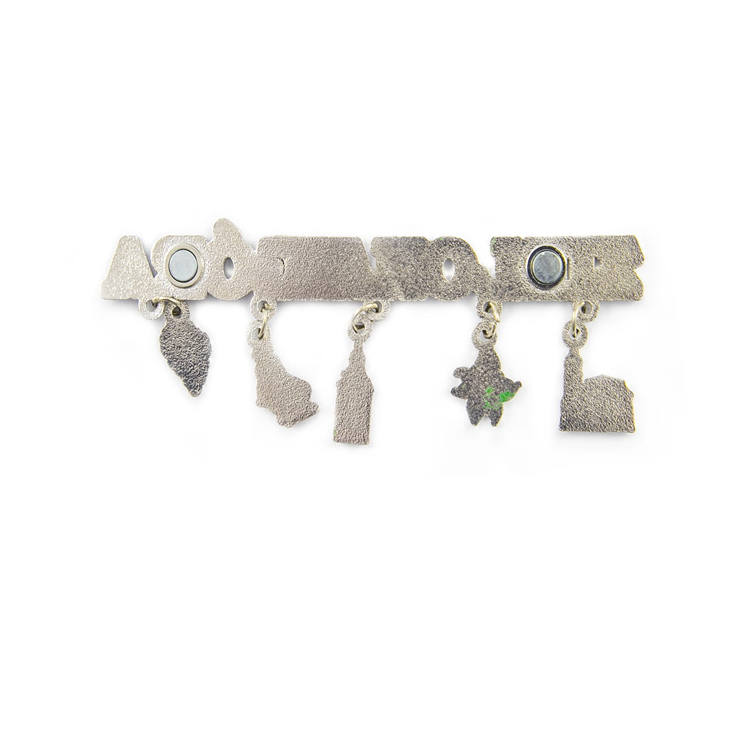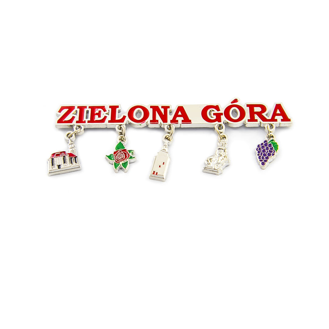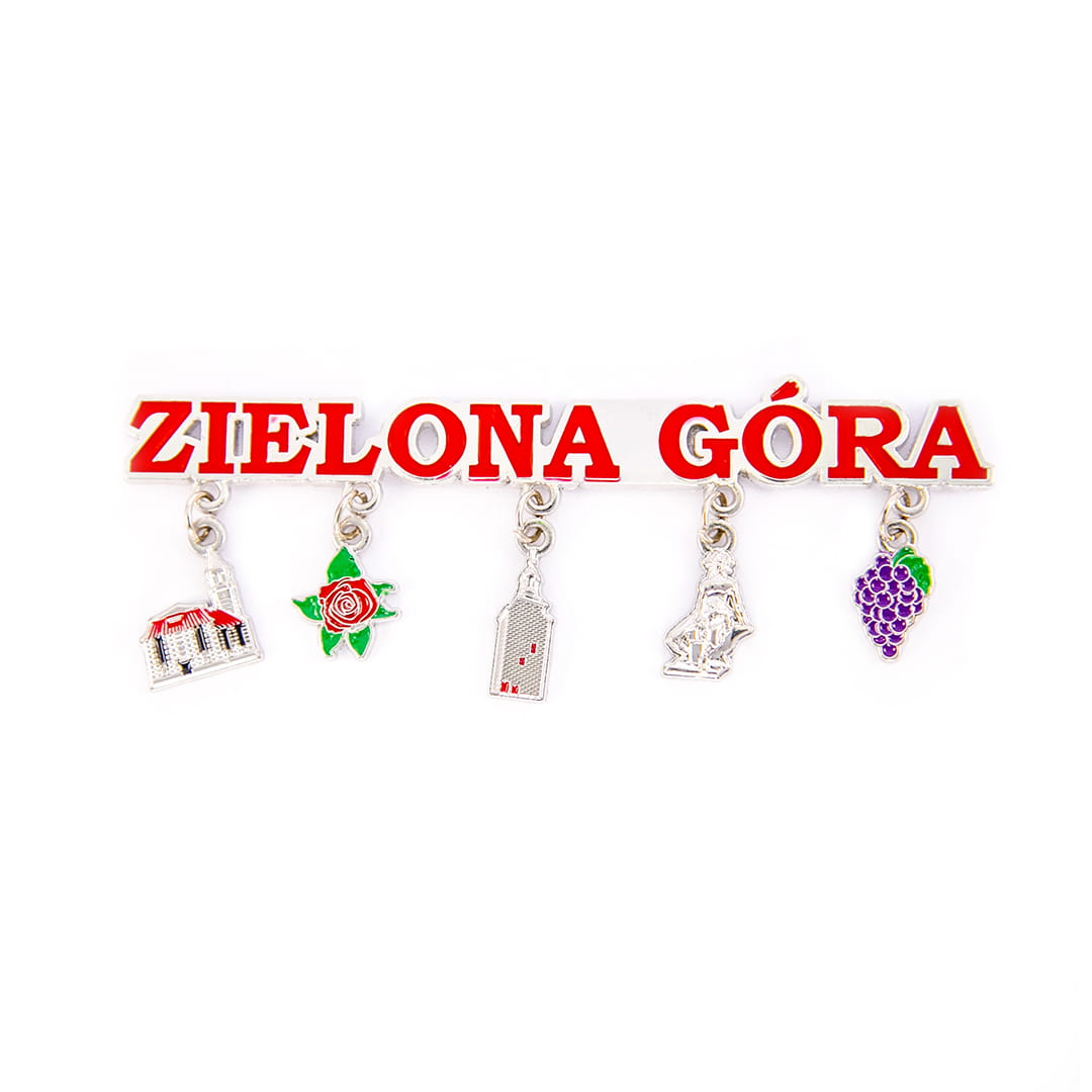 Metalowy magnes na lodówkę w kształcie napisu "Zielona Góra" z zawieszkami charakterystycznymi dla tego miasta: Pomnik Bachusa, Wieża Łazienna, Kościół Matki Bożej Częstochowskiej oraz czerwony kwiatek i kiść winogron. Napis z nazwą miasta wypełniony jest czerwoną emalią. Na jego rewersie znajdują się dwa małe, lecz silne magnesy zapewniające trwałe, bezpieczne przyczepienie do metalowej powierzchni.