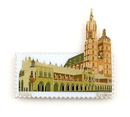 Metalowy magnes w postaci znaczka pocztowego, przedstawiający Krakowskie sukiennice w tle z kościołem Mariackim.