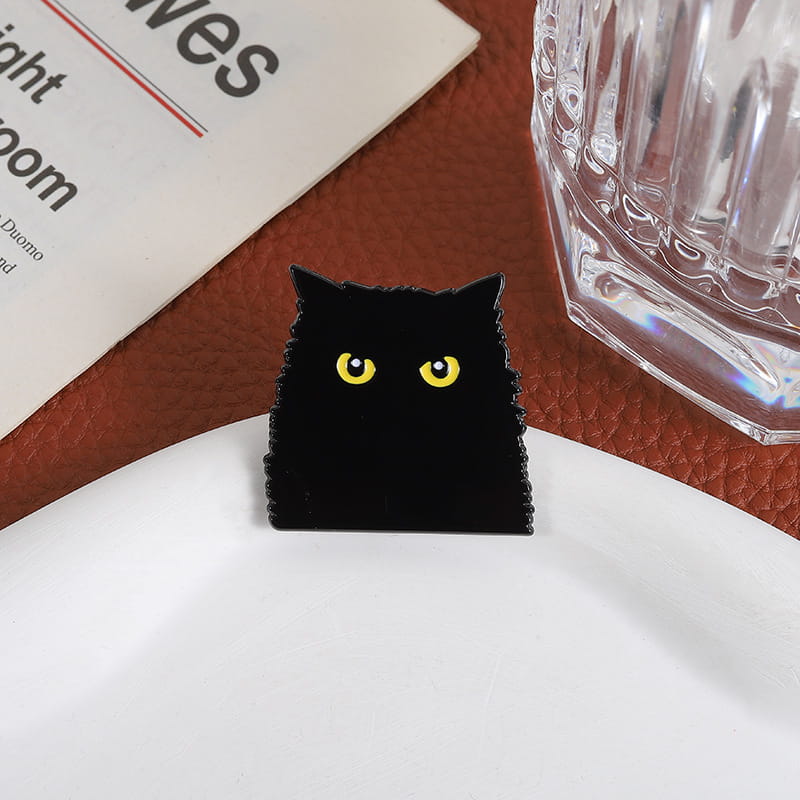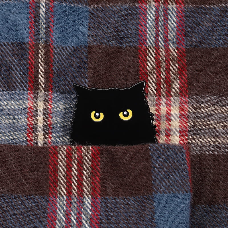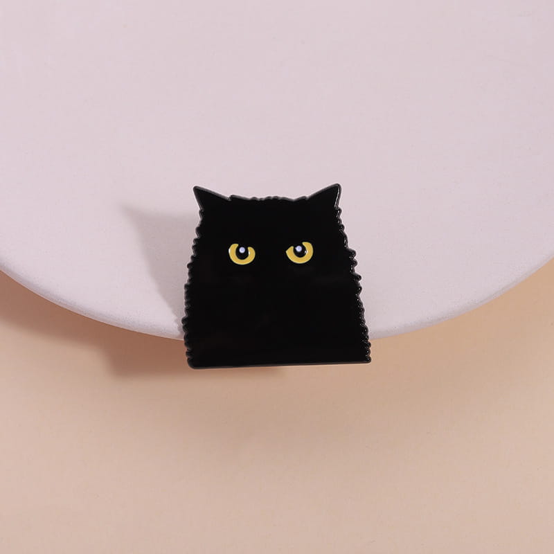 Przypinka "Czarny Kot" – Hipnotyzujące spojrzenie Dodaj odrobinę tajemniczości do swojego stylu! Ta metalowa przypinka przedstawia czarnego kota o przenikliwych, żółtych oczach. Minimalistyczny, a jednocześnie wyrazisty design sprawia, że będzie świetnym dodatkiem zarówno dla miłośników kotów, jak i fanów niebanalnych akcesoriów.