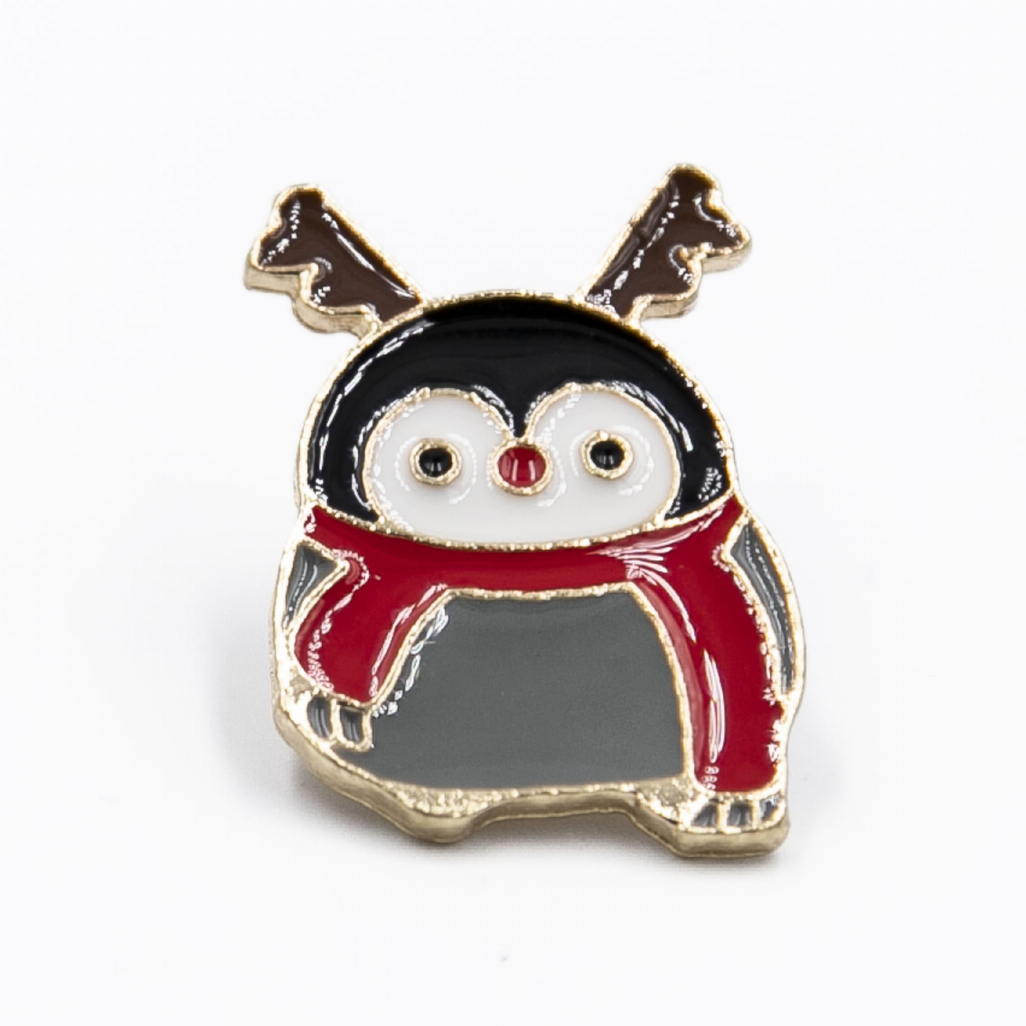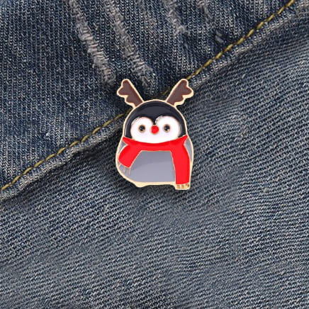 Metalowa przypinka idealna do ubrania, fartucha, czy też torby. Pingwin ubrany w strój świąteczny renifera Rudolfa. Na prezent, na święta, jako ozdoba.