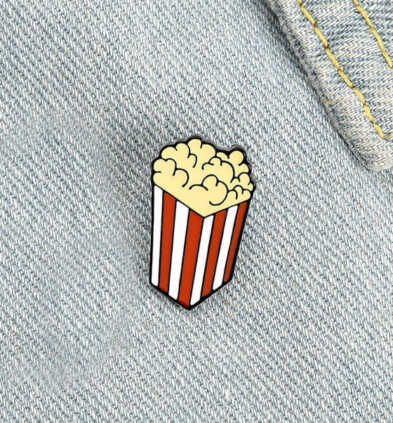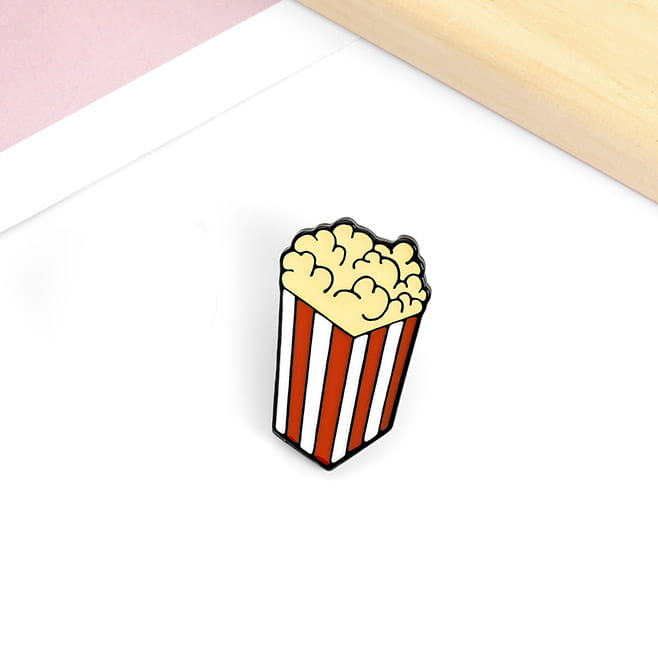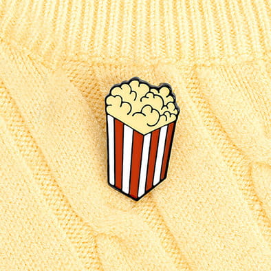 Metalowa przypinka idealna do dekoracji ubrania, fartucha, czy też torby. Prezentuje charakterystyczny, znany między innymi z sal kinowych, papierowy pojemnik, wypełniony uprażonym popcornem. Idealna dla fanów kina i popcornu. Przypinka jest bardzo łatwa w zaczepieniu. Zakończona gumową nakładką na 'pin' świetnie trzyma się ubrania, dobrze przylegając do materiału.