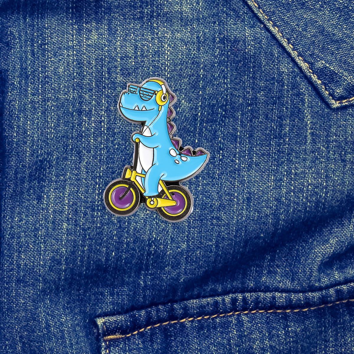 Zabawna, metalowa przypinka, idealna do dekoracji ubrania, plecaka, czy też torby. Prezentuje małego śmiesznego dinozaura jadącego na rowerze ze słuchawkami na głowie. Zakończona gumową nakładką na 'pin', która świetnie mocuje przypinkę do garderoby, dobrze przylegając do materiału.