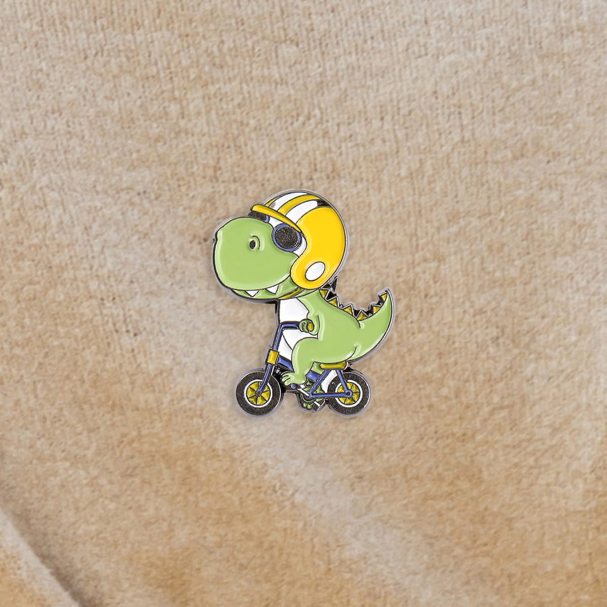 Zabawna, metalowa przypinka, idealna do dekoracji ubrania, plecaka, czy też torby. Prezentuje małego śmiesznego dinozaura w żółtym kasku jadącego na rowerze. Zakończona gumową nakładką na 'pin', która świetnie mocuje przypinkę do garderoby, dobrze przylegając do materiału.