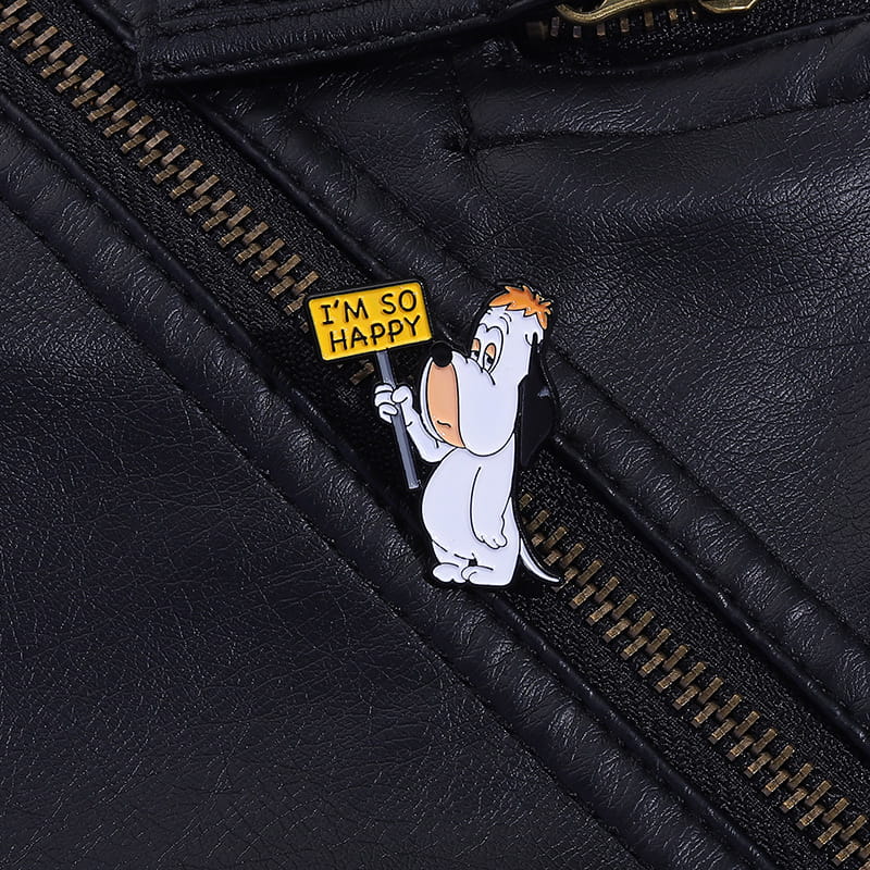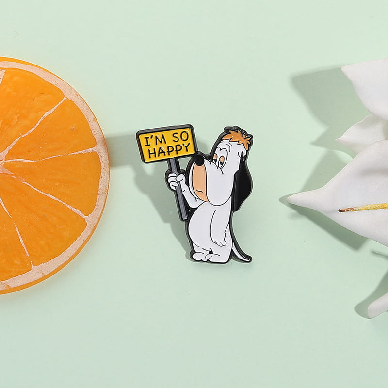 Przypinka "I’m So Happy" – Piesek z ironicznym wyrazem twarzy Dodaj odrobinę humoru do swojej stylizacji! Ta metalowa przypinka przedstawia uroczego, lecz ewidentnie niezbyt entuzjastycznego pieska trzymającego tabliczkę z napisem „I’m So Happy”. Idealna dla osób z dystansem do siebie i poczuciem ironii.