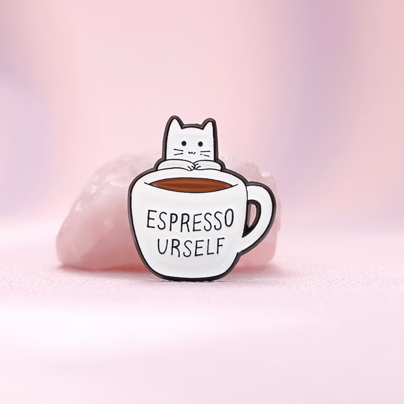 Metalowa, kolorowa przypinka w postaci kota wyglądającego z za filiżanki espresso. Z napisem "espresso yourself", które jest słowotworem łączącym słowa ""wyraź siebie"" i ""espressp"". Coś dla otwartych umysłow, kreatywnych fanów kawy. Zakończona gumową nakładką na 'pin', która świetnie mocuje przypinkę do garderoby, dobrze przylegając do materiału.