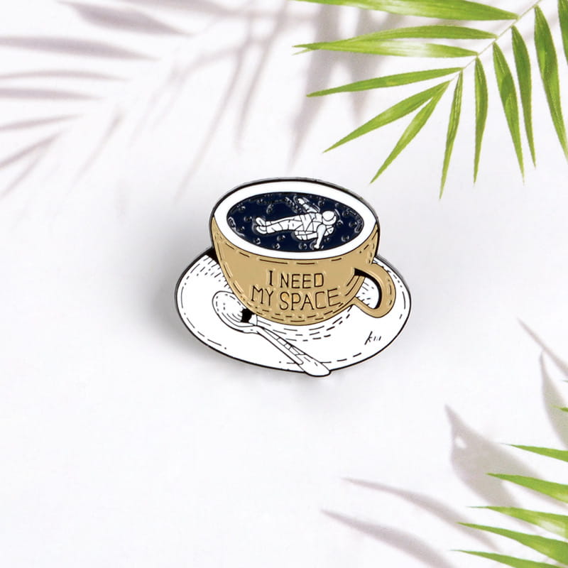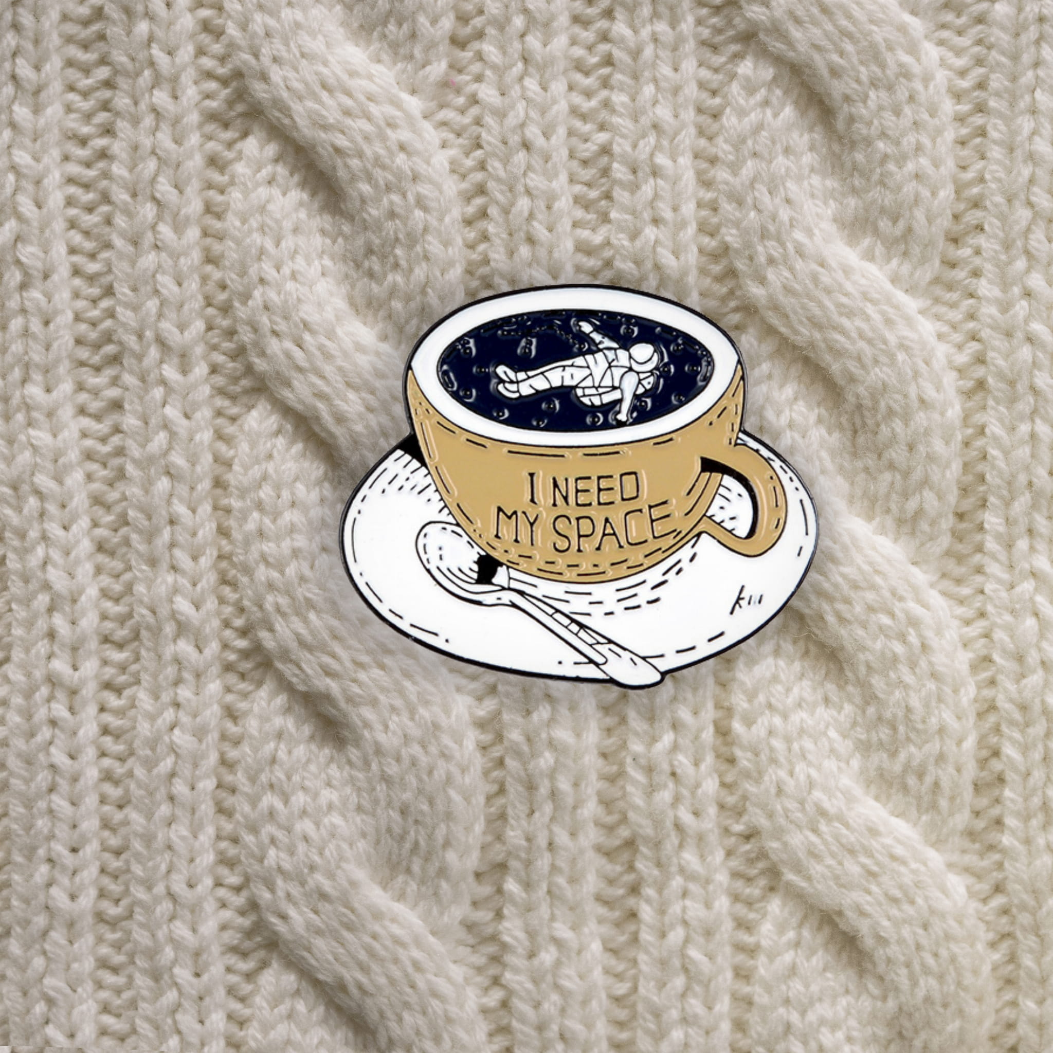 <p>Metalowa przypinka, idealna do dekoracji ubrania, plecaka, czy też torby. Prezentuje filiżankę kawy, w której dryfuje astronauta. Na naczyniu znajduje się napis "I need my space". Dwuznaczność i głębia przekazu, którą świetnie zrozumieją kawosze i ludzie mocno zapracowani czy też marzyciele. Zakończona gumową nakładką na 'pin', która świetnie mocuje przypinkę do garderoby, dobrze przylegając do materiału.</p>