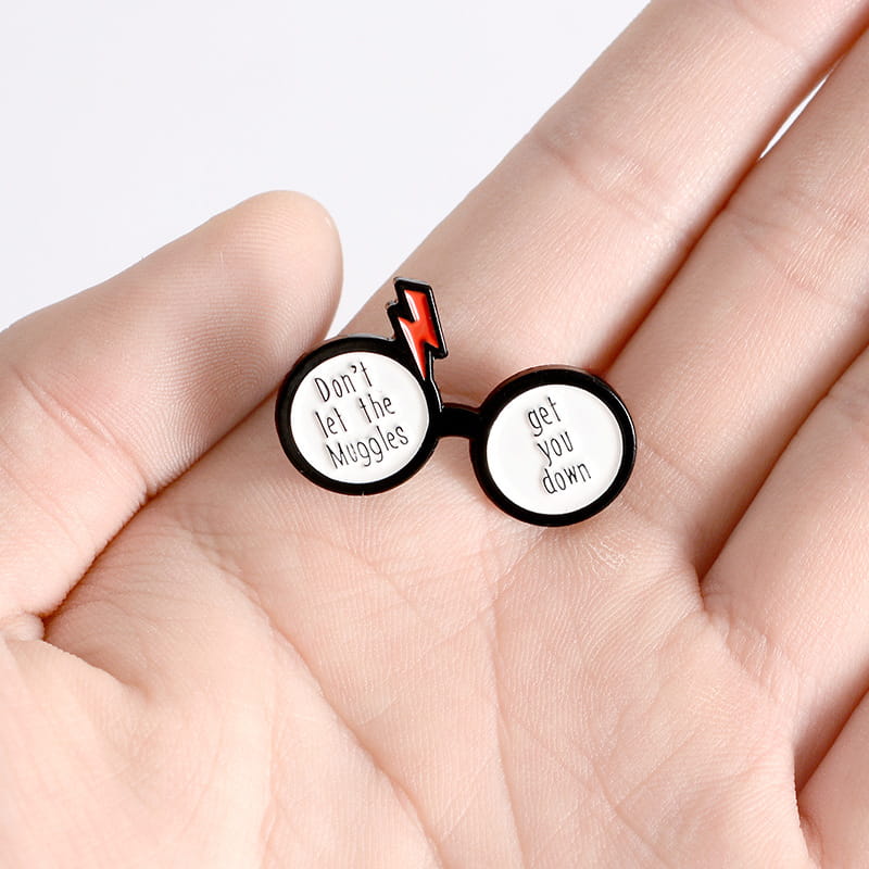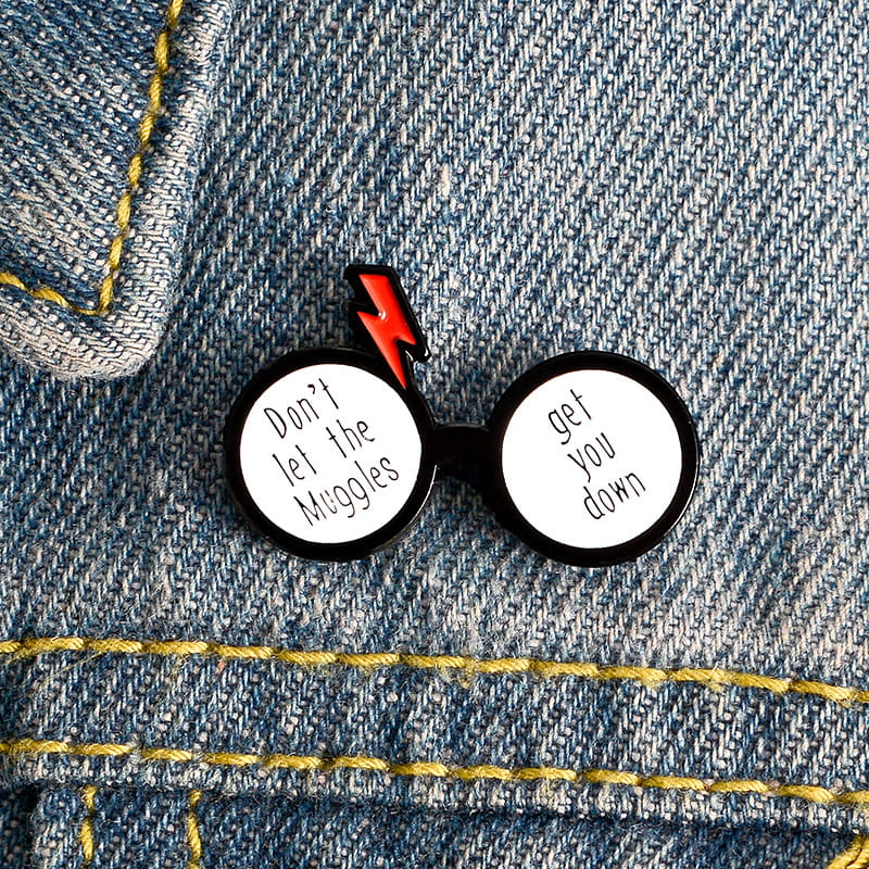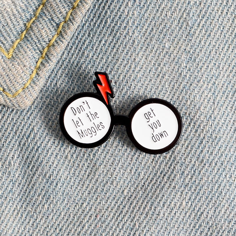 Metalowa przypinka, idealna do dekoracji ubrania, plecaka, czy też torby. Przedstawia napis "Don't let the Muggles get you down" umieszczony w okularach mocno nawiązujących do Harrego Pottera. Świetny dla fanów przygód młodego czarodzieja. Zakończona gumową nakładką na 'pin', która świetnie mocuje przypinkę do garderoby, dobrze przylegając do materiału.
