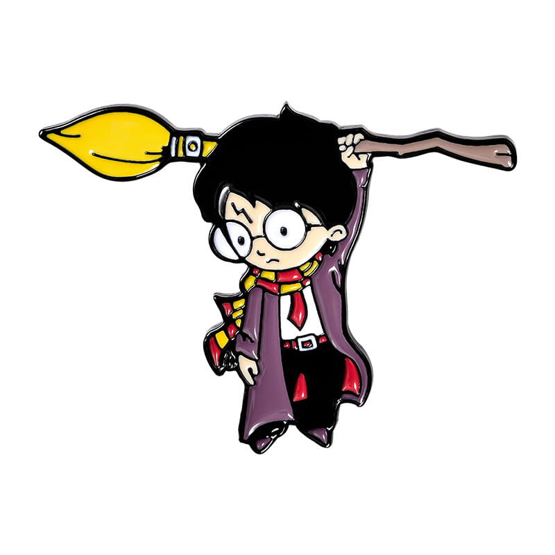 Metalowa przypinka, idealna do dekoracji ubrania, plecaka, czy też torby. Przedstawia postać Harrego Pottera z miotłą. Świetna dla fanów serii o młodym czarodzieju. Zakończona gumową nakładką na 'pin', która świetnie mocuje przypinkę do garderoby, dobrze przylegając do materiału.