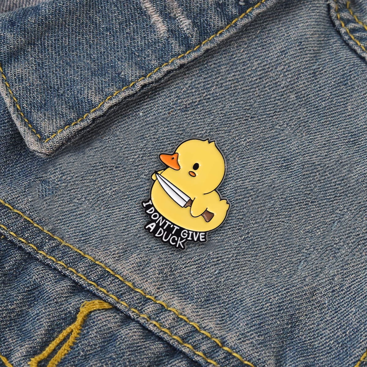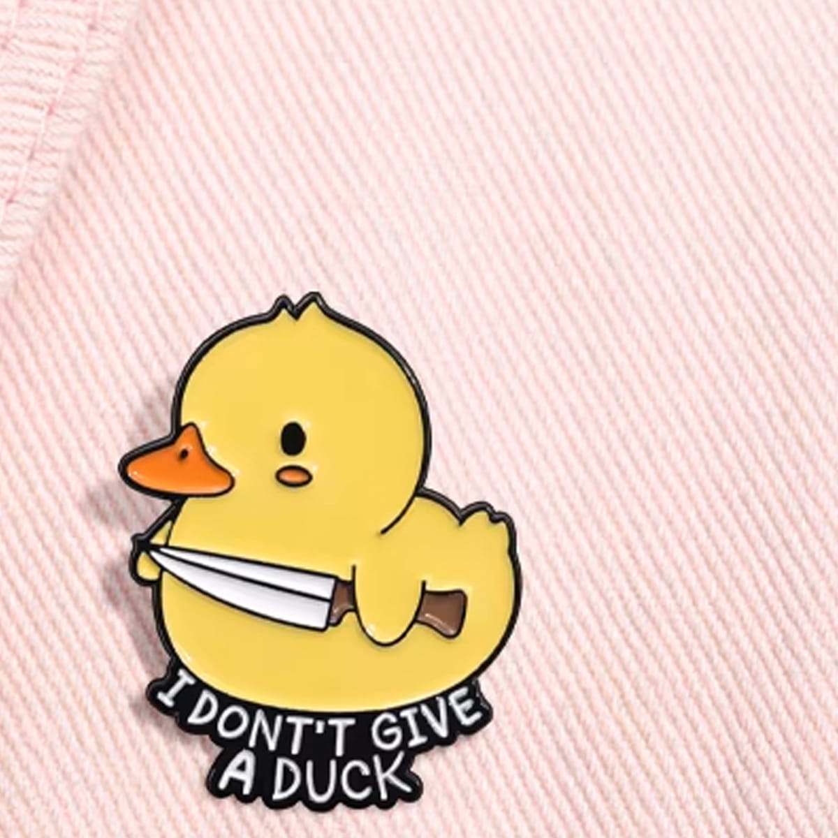 Metalowa przypinka, idealna do dekoracji ubrania, plecaka, czy też torby. Prezentuje ona małą, żółtą kaczuszkę z wielkim nożem kuchennym i napisem ""I don't give a duck"". Idealna dla osób lubiących czarny humor. Zakończona gumową nakładką na 'pin', która świetnie mocuje przypinkę do garderoby, dobrze przylegając do materiału.