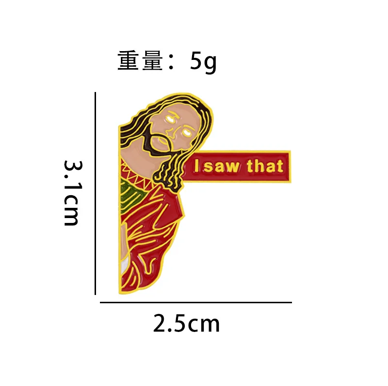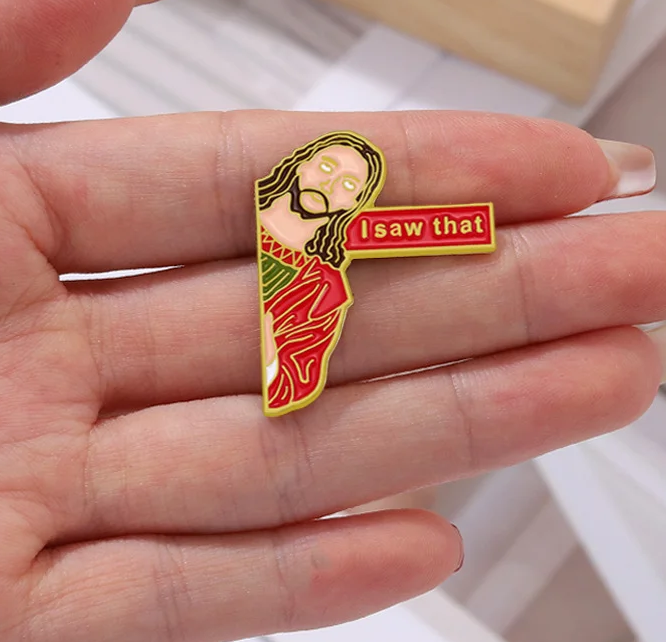 Metalowa przypinka z Jezusem i napisem " I saw that". Niech przypomina karzdemu nigrzecznemu chłopcu i niedobrej dizewczynce że Pan patrzy i ocenia ich zachowanie. Wszystko z lekką nutą ironii i humoru.