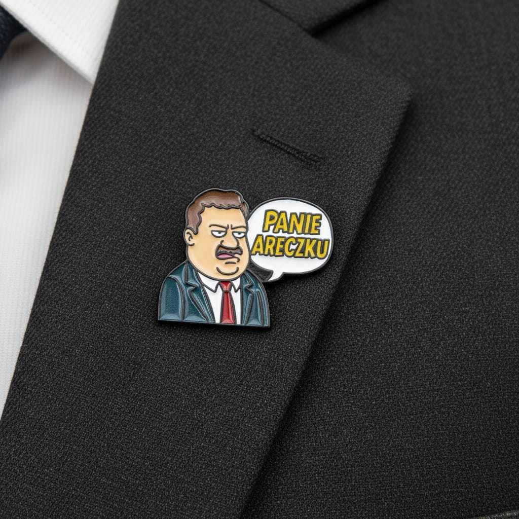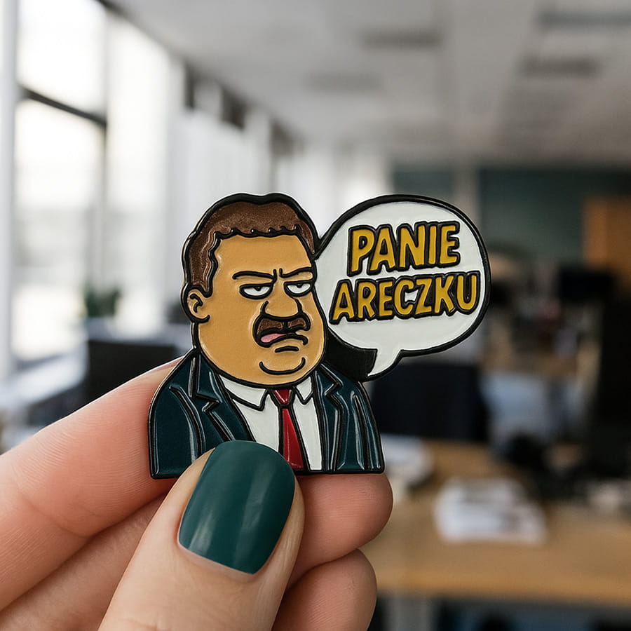 Metalowa przypinka inspirowana jednym z najpopularniejszych polskich memów. Charakterystyczna, lekko zirytowana postać w garniturze i kultowy tekst „Panie Areczku” to połączenie, które rozpozna każdy fan rodzimego internetowego humoru. Idealna dla osób, które lubią puścić oczko do innych memiarzy – subtelnie, ale dosadnie.
