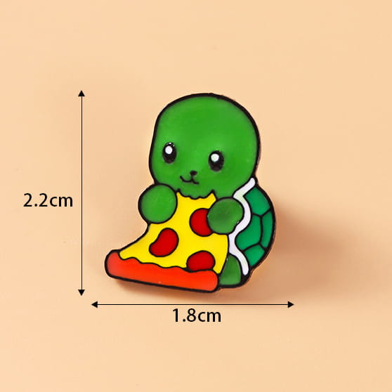 Metalowa przypinka, idealna do dekoracji ubrania, plecaka, czy też torby. Prezentuje małego żółwia jedzącego pizze. Świetna przypinka dla fanów pizzy, żółwi, dobrego poczucia humoru. Zadowoli również fanów bajkowych żółwi ninja. Zakończona gumową nakładką na 'pin', która świetnie mocuje przypinkę do garderoby, dobrze przylegając do materiału.