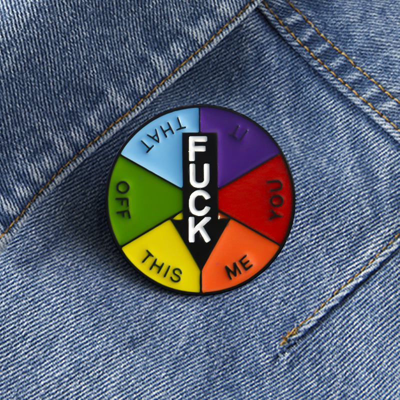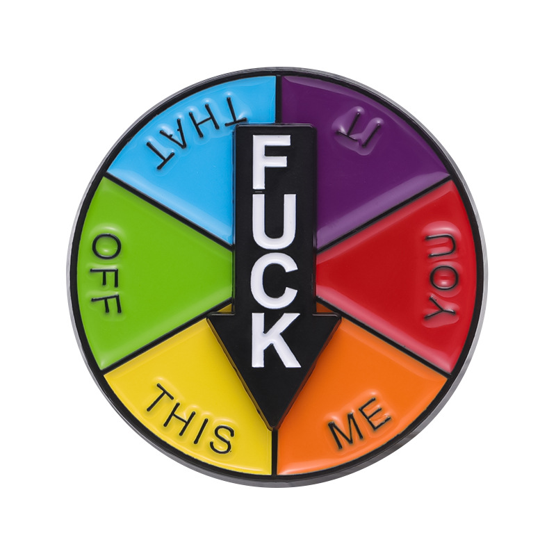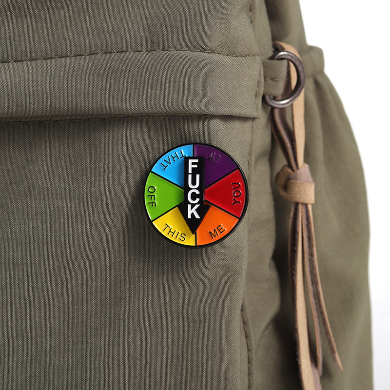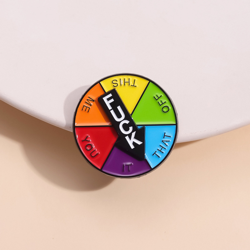 Metalowa, kolorowa przypinka w postaci okrągłej tablicy z obrotową strzłką. Strzałkę można obracać i losować odpowiedź na nurtujący nas problem :-) . Zakończona gumową nakładką na 'pin', która świetnie mocuje przypinkę do garderoby, dobrze przylegając do materiału.