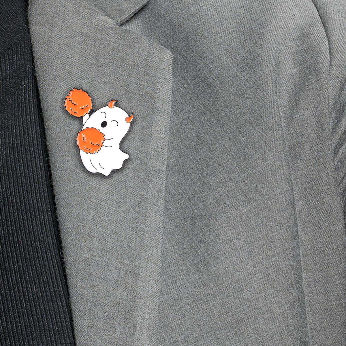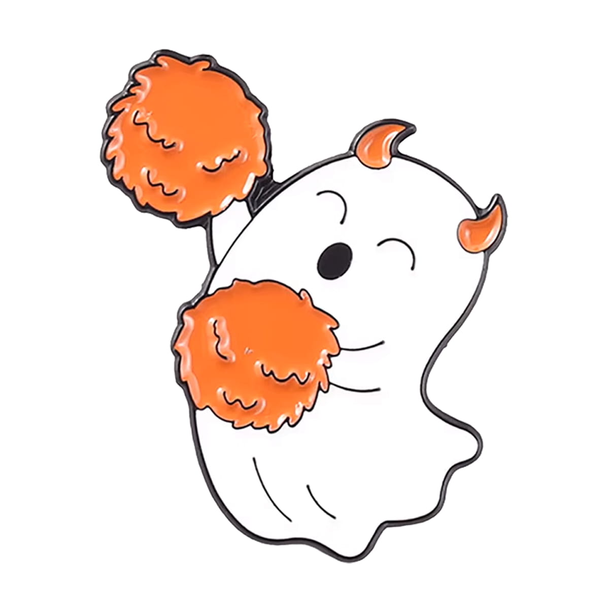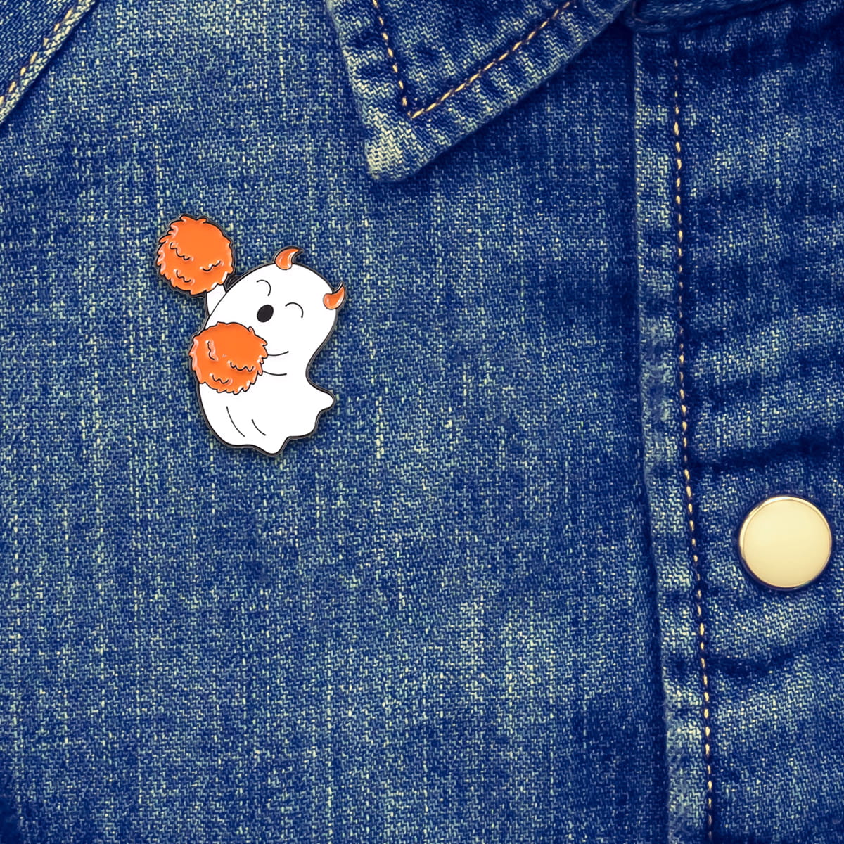 Metalowa przypinka, idealna do dekoracji ubrania, plecaka, czy też torby. Prezentuje ona zabawnego duszka z pomarańczowymi rogami i pomponami. Doskonała na Halloween lub dla osób lubiących czarny humor i klimaty paranormalne. Zakończona gumową nakładką na 'pin', która świetnie mocuje przypinkę do garderoby, dobrze przylegając do materiału.