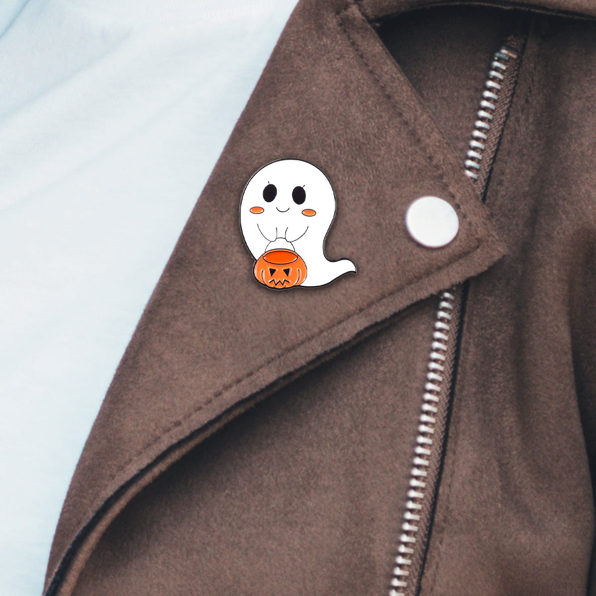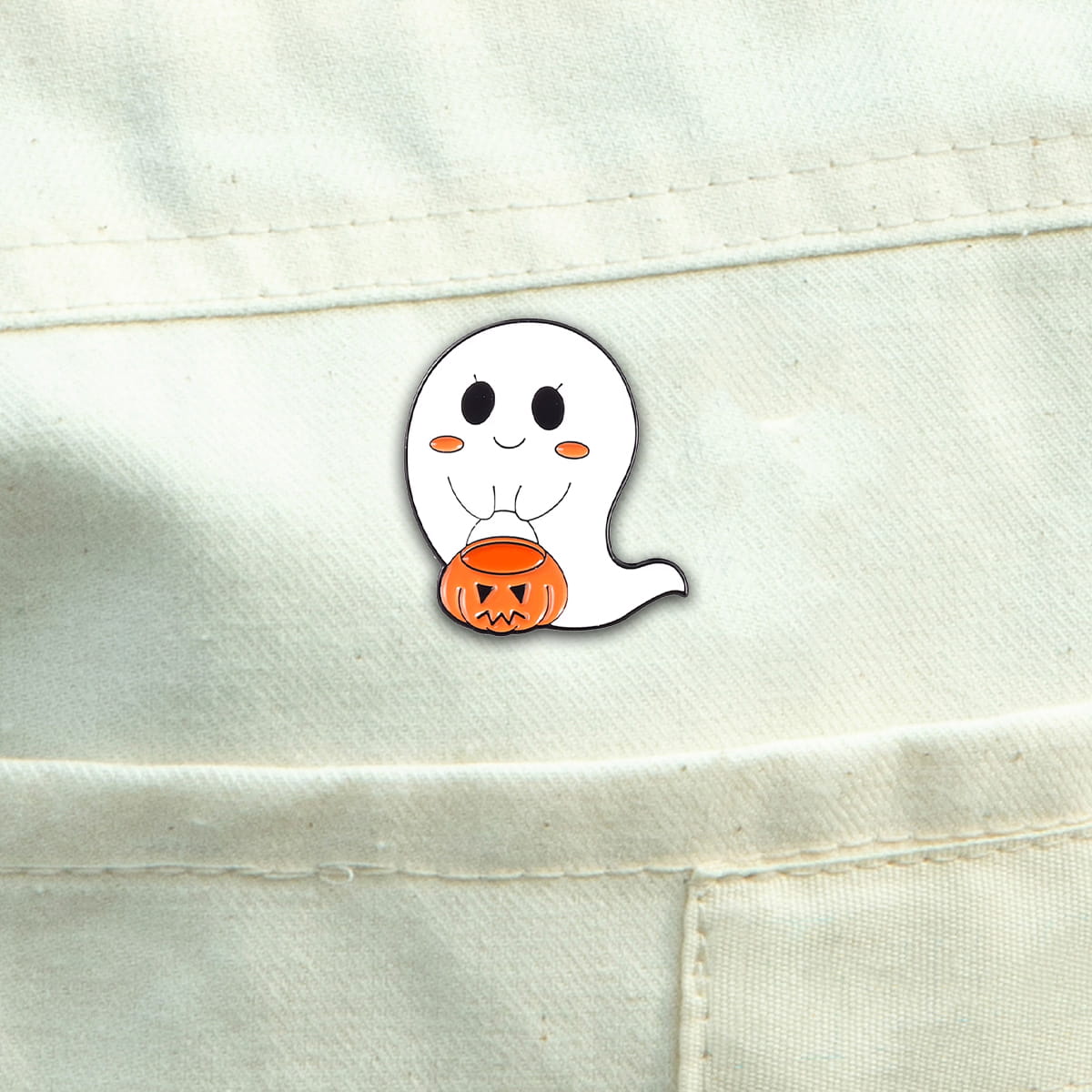 Metalowa przypinka, idealna do dekoracji ubrania, plecaka, czy też torby. Prezentuje ona zabawnego, sympatycznego duszka z pomarańczową dynią. Doskonała na Halloween lub dla osób lubiących czarny humor i klimaty paranormalne. Zakończona gumową nakładką na 'pin', która świetnie mocuje przypinkę do garderoby, dobrze przylegając do materiału.