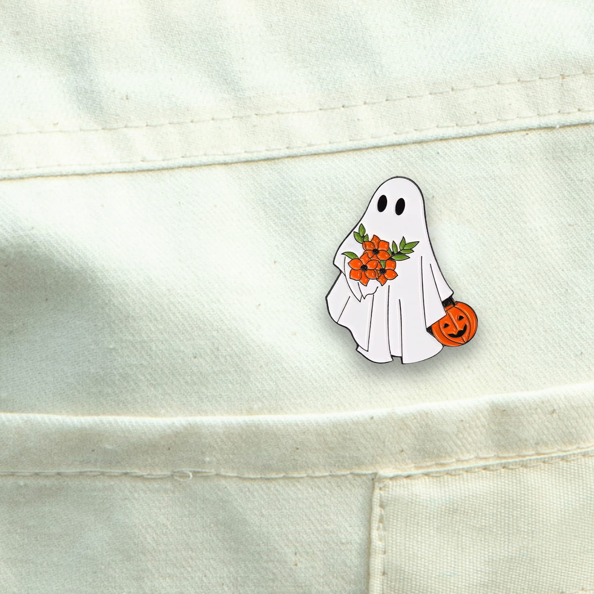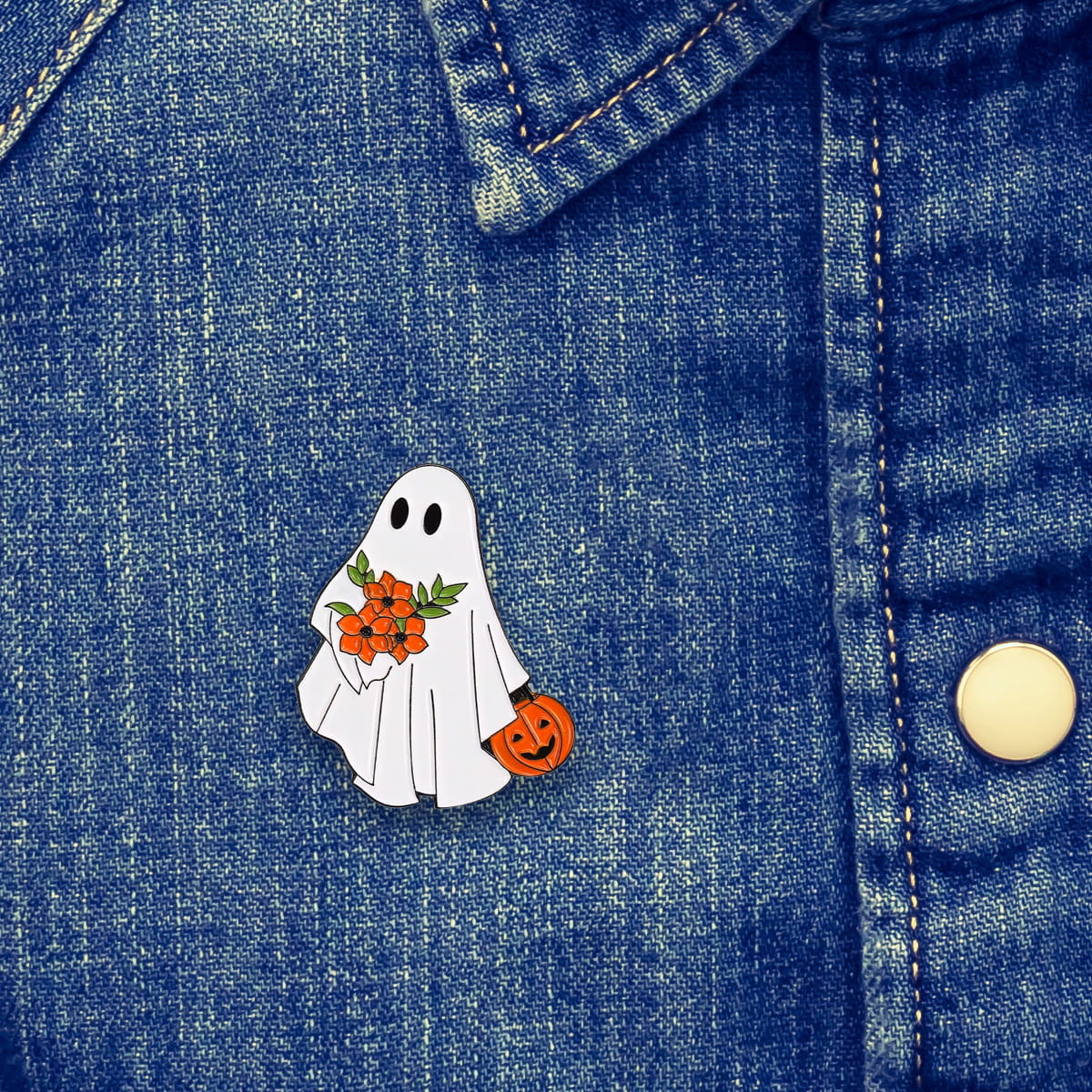 Metalowa przypinka, idealna do dekoracji ubrania, plecaka, czy też torby. Prezentuje ona duszka z pomarańczowymi kwiatkami i dyńką w dłoni. Doskonała na Halloween lub dla osób lubiących czarny humor i klimaty paranormalne. Zakończona gumową nakładką na 'pin', która świetnie mocuje przypinkę do garderoby, dobrze przylegając do materiału.
