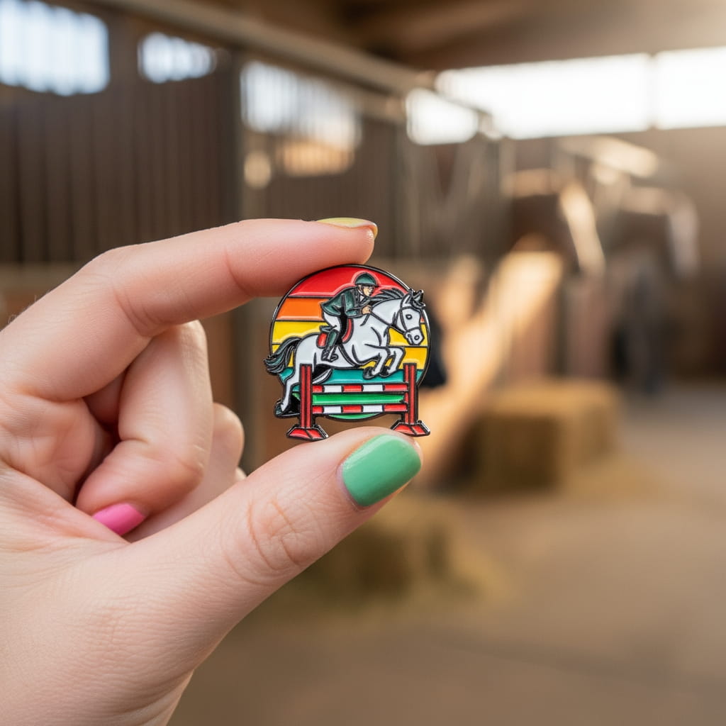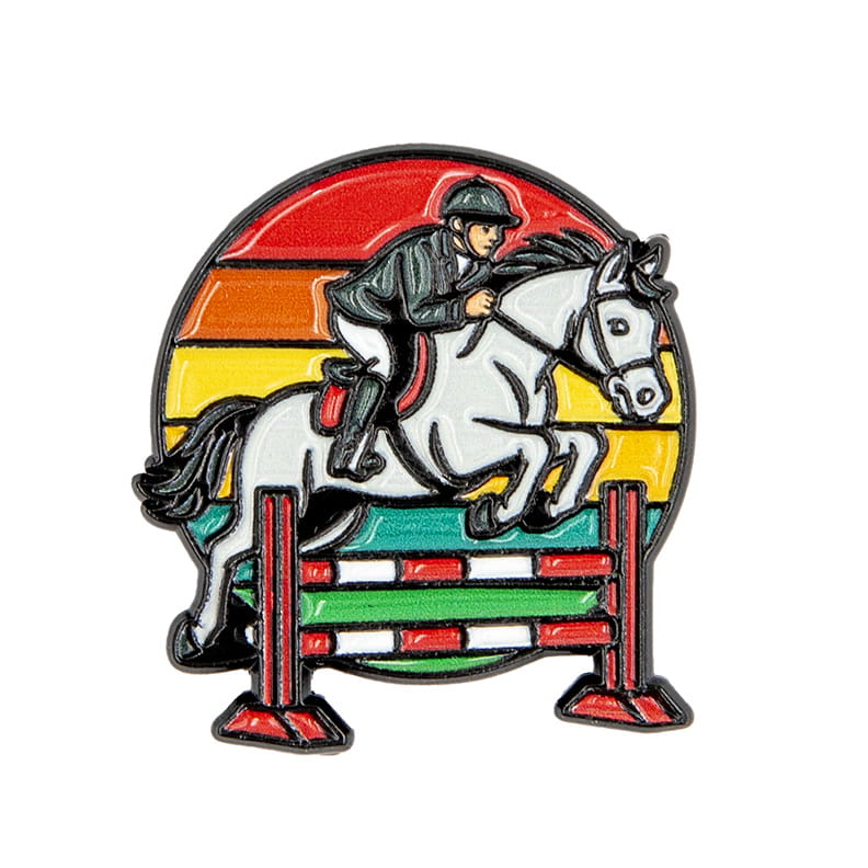 Metalowa przypinka przedstawiająca jeźdźca na koniu w trakcie skoku przez przeszkodę. Idealna dla miłośników jeździectwa, zawodników oraz fanów sportów konnych. Energetyczne, tęczowe tło dodaje przypince wyrazistości i wyjątkowego charakteru.