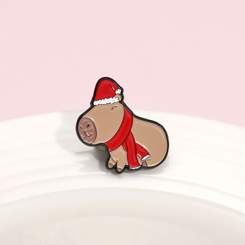 Metalowa, kolorowa przypinka w postaci uroczego zwierzątka jakim jest kapibara, ubranego czapkę i szalik świętego mikołaja. Zakończona gumową nakładką na 'pin', która świetnie mocuje przypinkę do garderoby, dobrze przylegając do materiału.